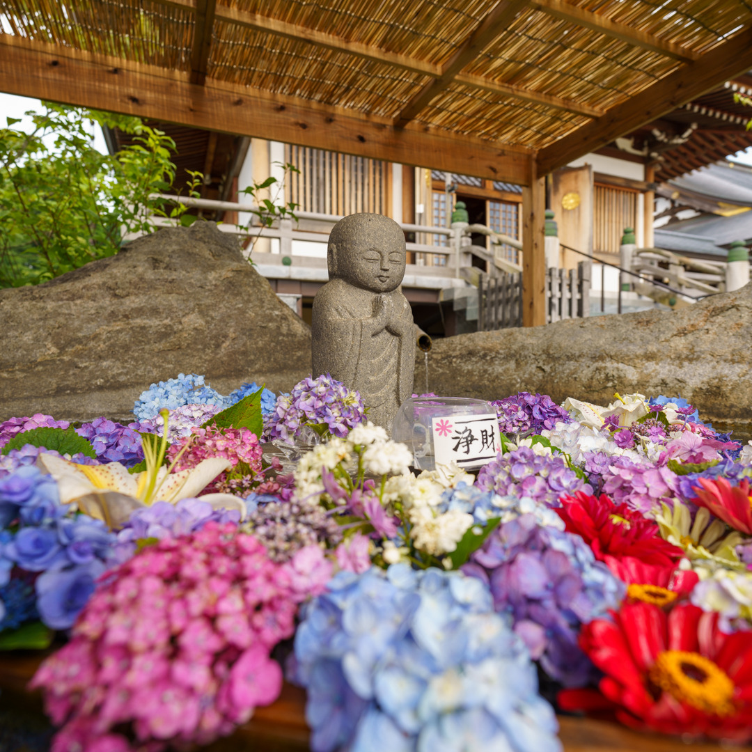 また、境内(けいだい)にはたくさんの八重桜や紫陽花などが植えられていて、四季折々の素晴らしい風景が楽しめます。