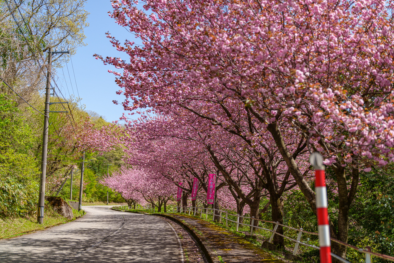 春には山頂本堂への参道にある八重桜が満開に。その数は約6,000本で、見頃の4月中旬から下旬には山の緑と八重桜の美しい光景を見ることができます。