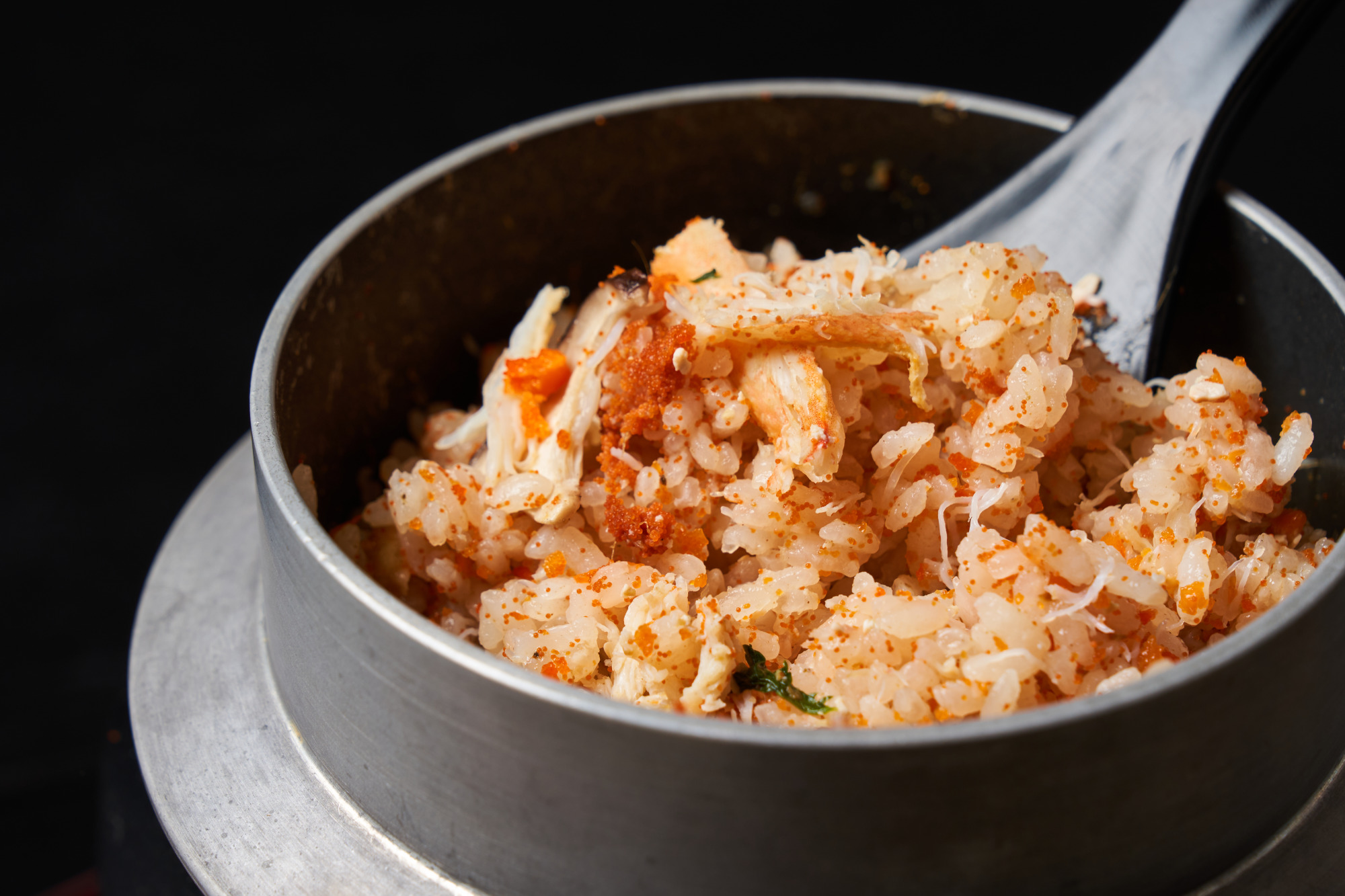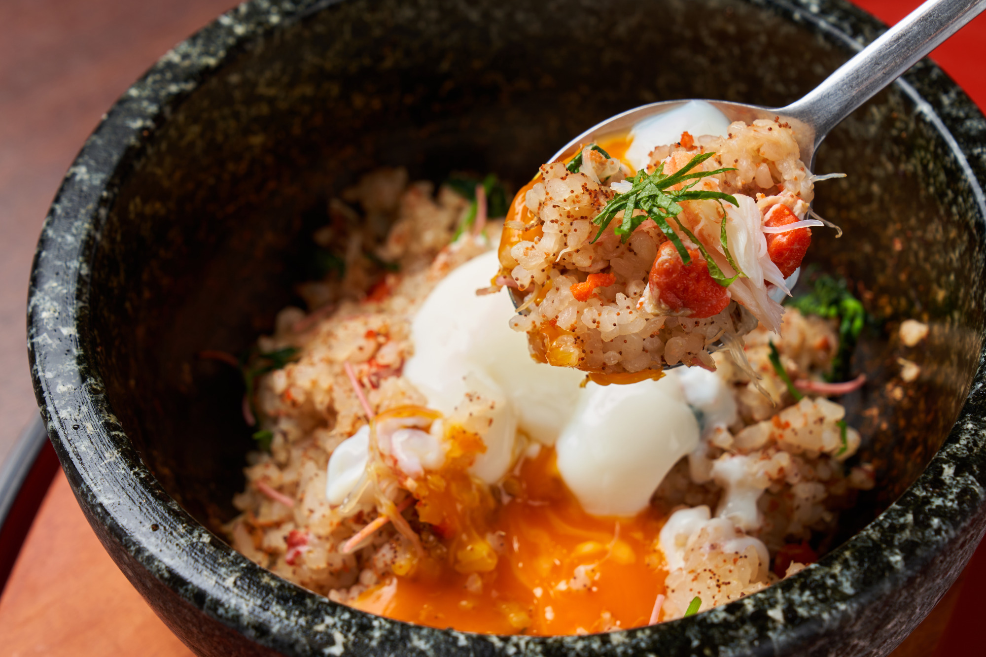 熱々の石焼きで頂く絶品石焼カニめしはその名の通り、3度違う味わいが楽しめる逸品。