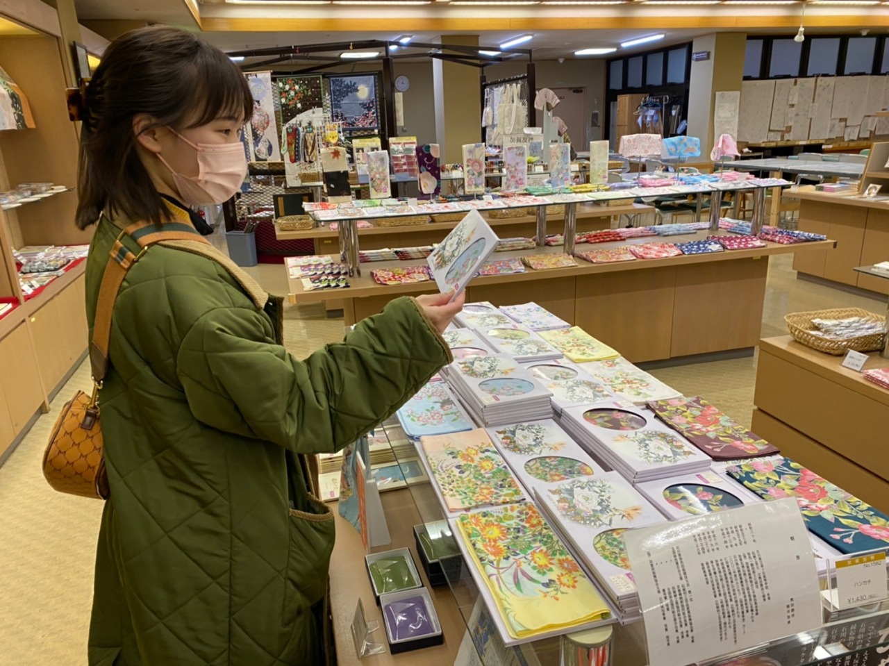 こちらでは、手作り体験コーナーをはじめ、新作加賀友禅の展示、友禅小物の販売などを行っており、金沢を代表する伝統工芸品のひとつ、「加賀友禅」の魅力を知ることができます。加賀友禅職人さんの素敵な作品を見ることができるなんて嬉しい。