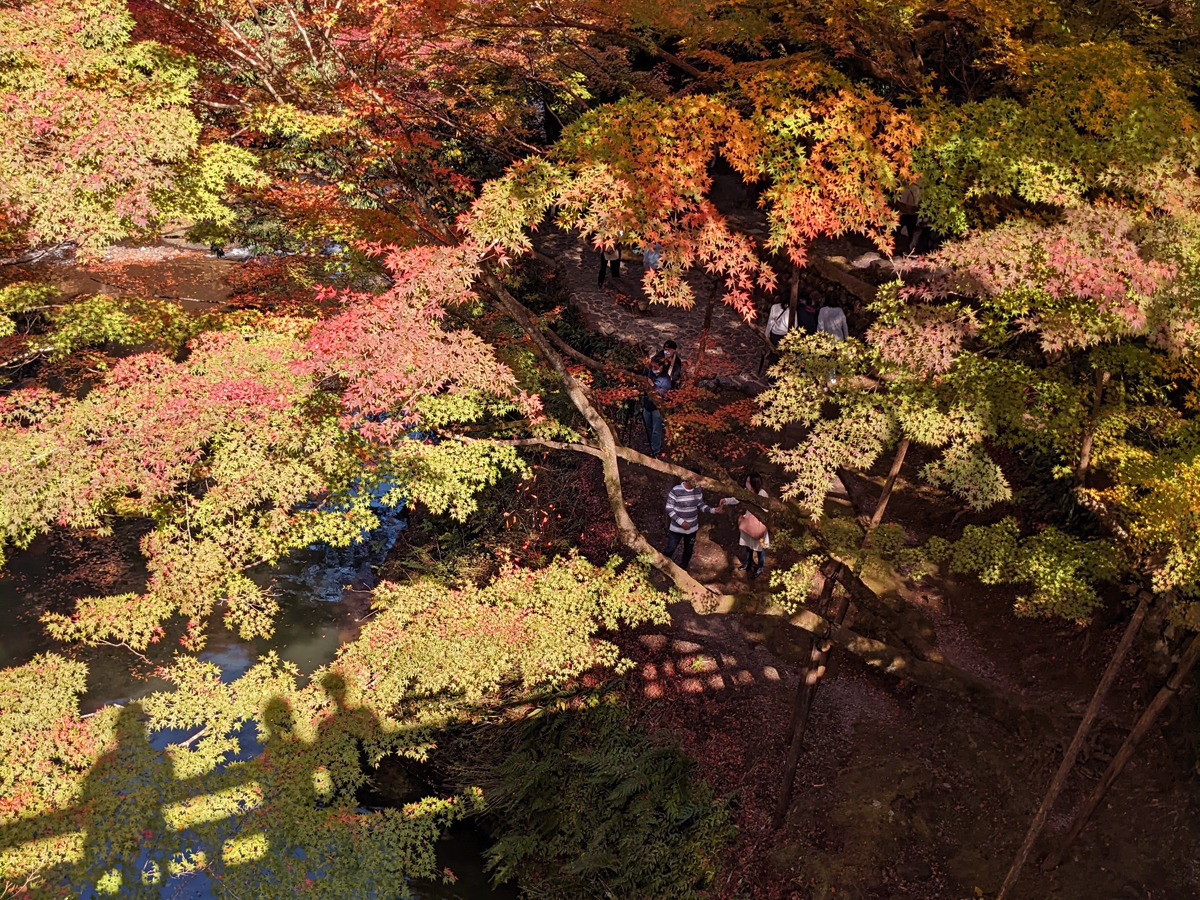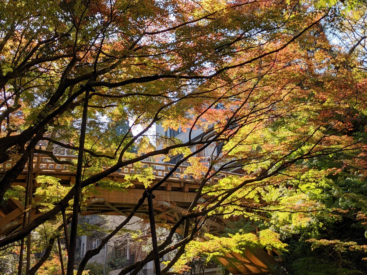 こおろぎ橋から見下ろす渓谷の美しさはもちろんですが、遊歩道から橋を見上げ、精緻な木組みを鑑賞するのもおすすめです。