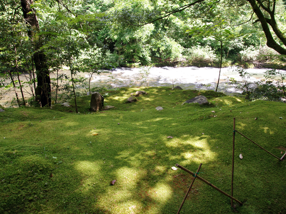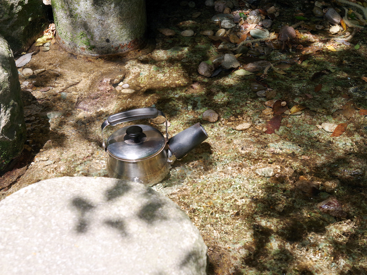 川床の一角にある「不動滝」からの流れの中に、やかんがひとつ。