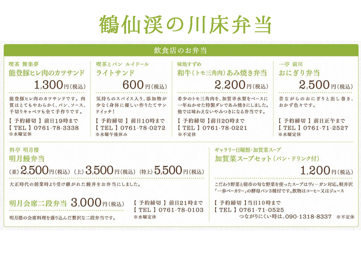 スイーツは、その場で注文できますが、川床弁当は、山中温泉にある6店舗で、それぞれにこだわりの詰まった川床弁当をテイクアウトして持参します。
