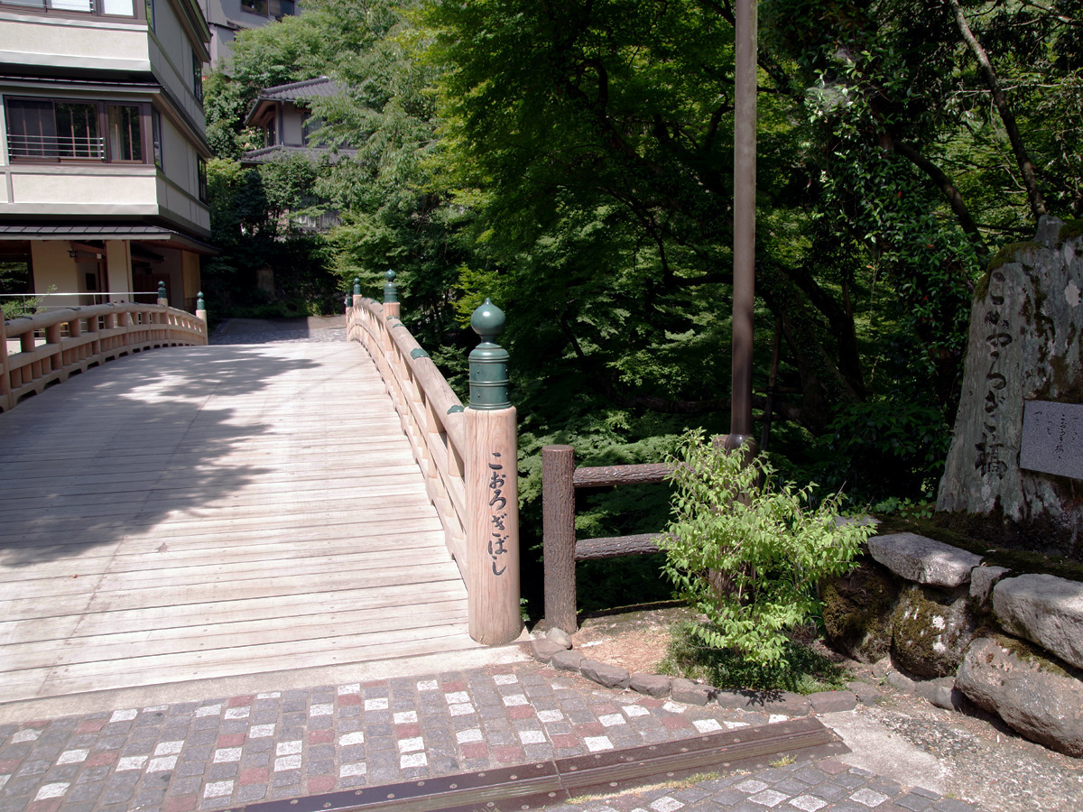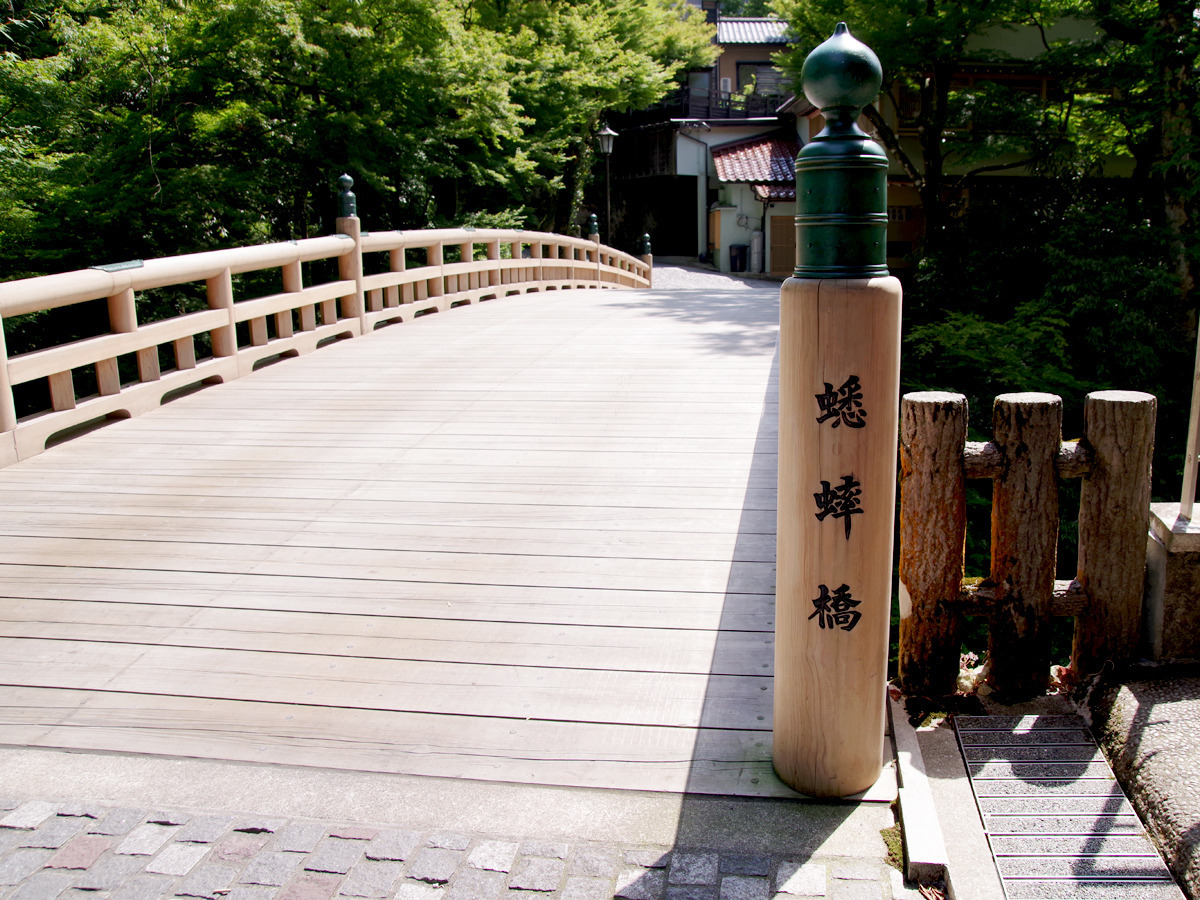 鶴仙渓に架かる総ひのきの造りの橋で、山中温泉を代表するスポットのひとつです。