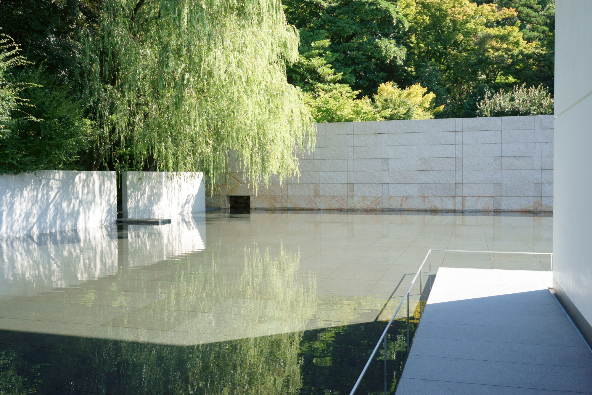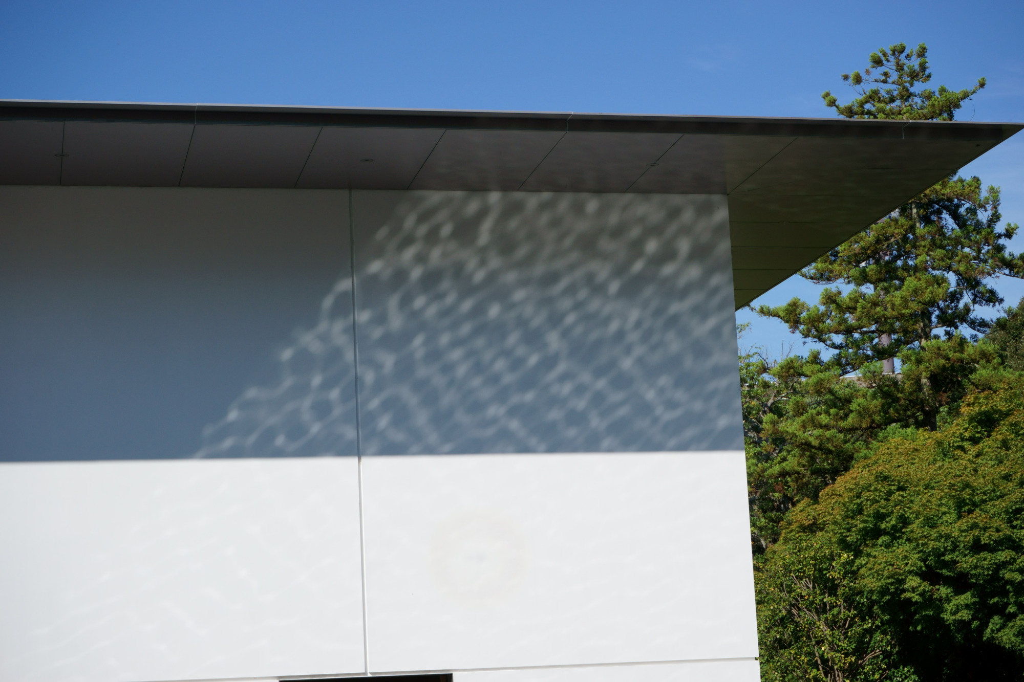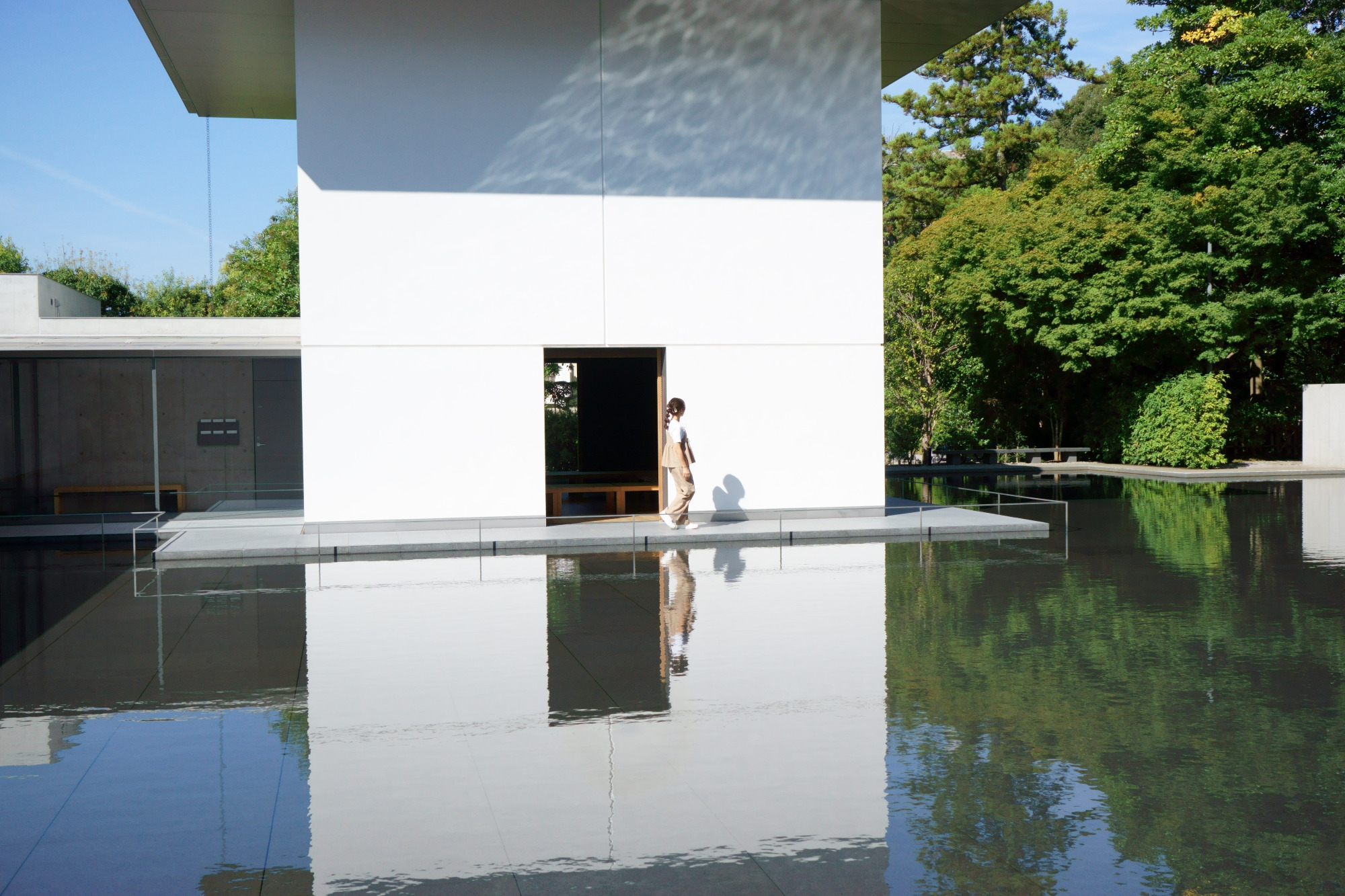 外部回廊や思索空間に面したかたちで、水鏡の庭があります。こちらが最高のフォトスポット。美しい建物が、これまた波のない水鏡のような水面に写ります。建物だけでなく、木々や青い空も角度や画角によっては入れ込んで、上下対照の写真が気持ちがいい。また水面に建物や木々が写るだけではなく、建物の白壁にも水面から光が反射します。撮るたびに異なる「幾何学模様」は、自然が生み出すデザインになっています。