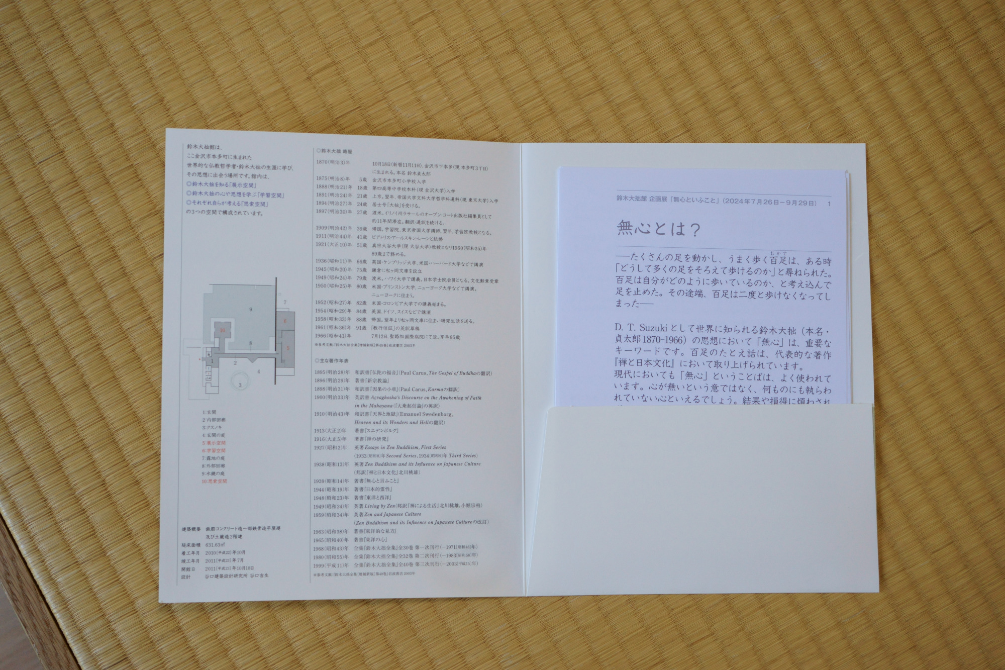 館内に入ると、エントランスで、鈴木大拙のプロフィールなどが書かれたファイルをもらえます。館内のいくつかの場所には、「名言」とその解説が書かれたリーフレットが置いてあり、それを収集してファイルに収納する仕組みです。これまで50以上の名言がリーフレットになっていますが、それをまとめたり、本にする予定はないとのことなので、ぜひ実際に訪れて収集してみたいもの。
