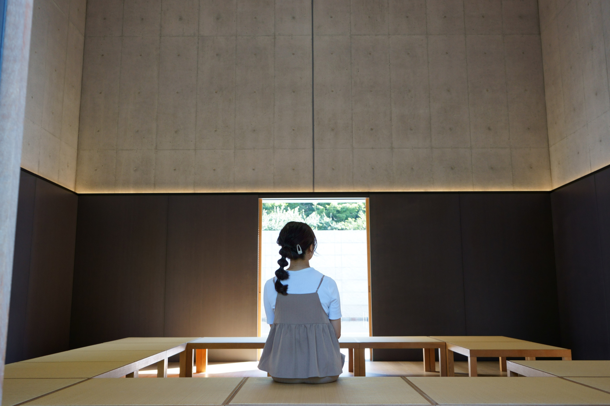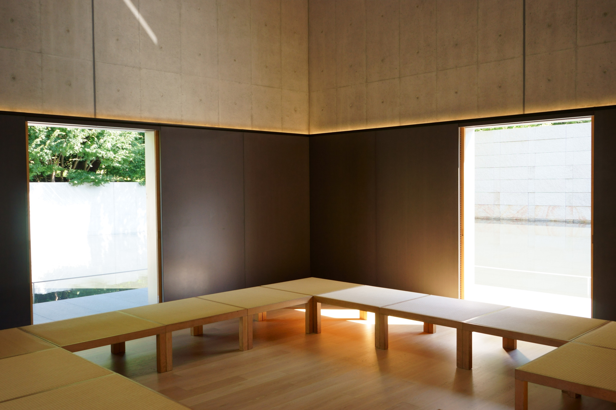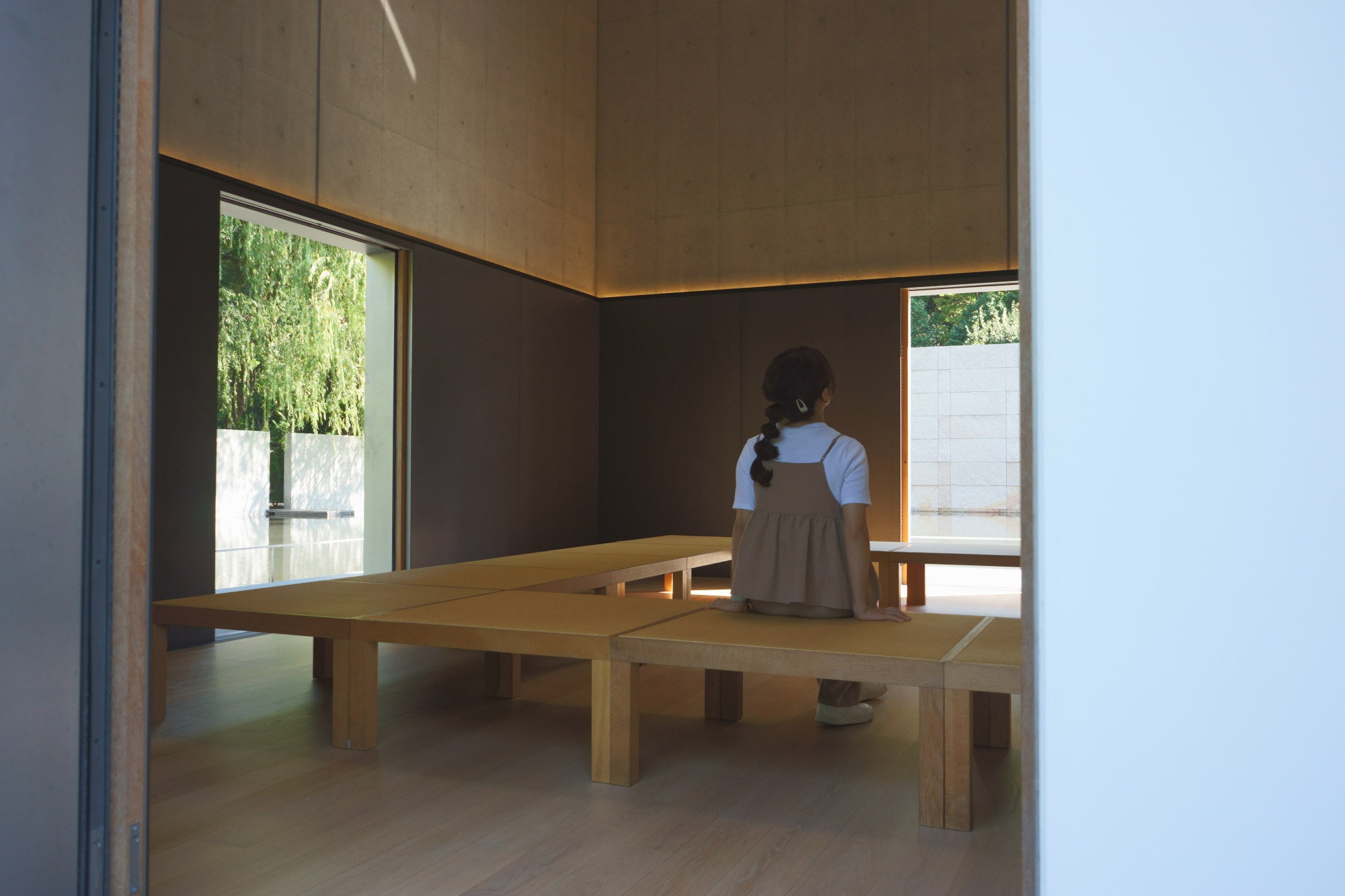 館内を順路通りに回ると、最後は「思索空間」にたどり着きます。箱型の空間で四方にトビラがあり、中央にベンチが置いてあります。静かに囲われていることを感じながら、目に入るのは水鏡の庭の水面くらい。館内で見て感じたことを頭の中で反芻するも良し、何も考えずにボーッとするも良し。