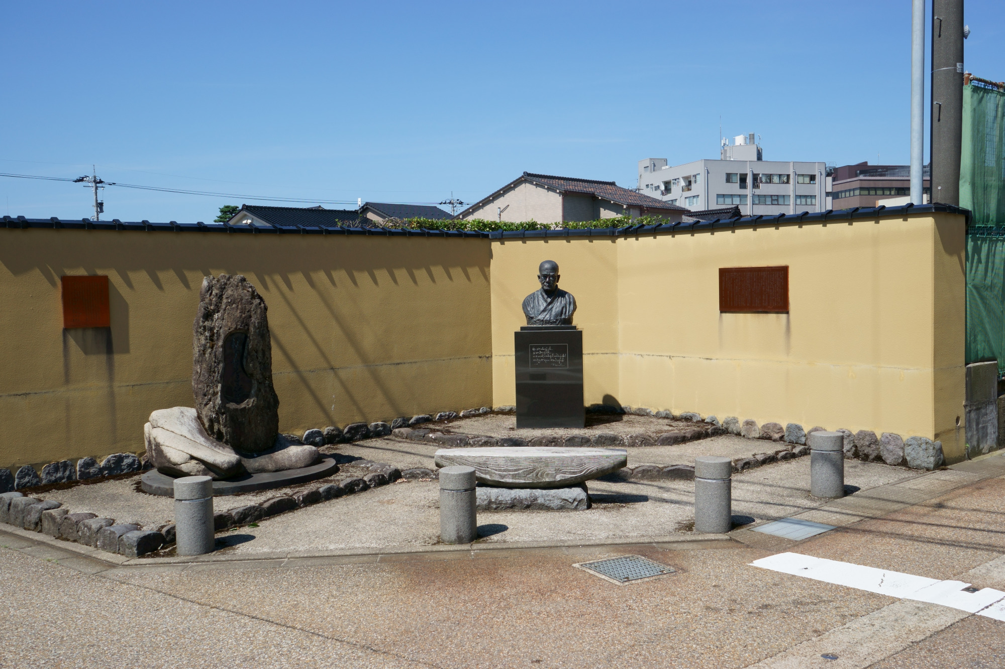 「鈴木大拙館にくるだけで鈴木大拙を感じてほしい」。そう語る学芸員は「生誕地の本多町にくるだけでもそれを感じられる」と教えてくれました。そこで最後により現実的なかたちとして訪れたいのが、鈴木大拙館から徒歩1分の場所にある「鈴木大拙生誕地記念碑」です。生誕137年目の誕生日に、この地に胸像ができました。