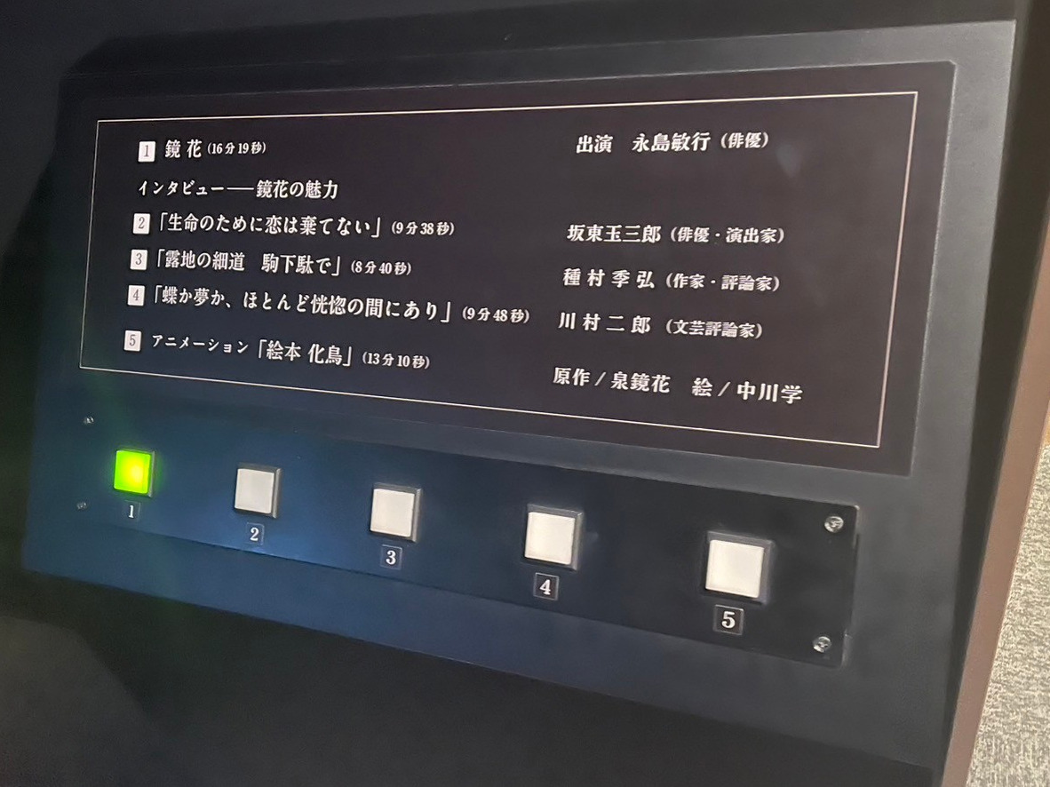 鏡花の生涯を綴った映像『鏡花』や、俳優・作家・評論家へのインタビュー映像『鏡花の魅力』、アニメーション絵本『化鳥』を楽しむことができます。
