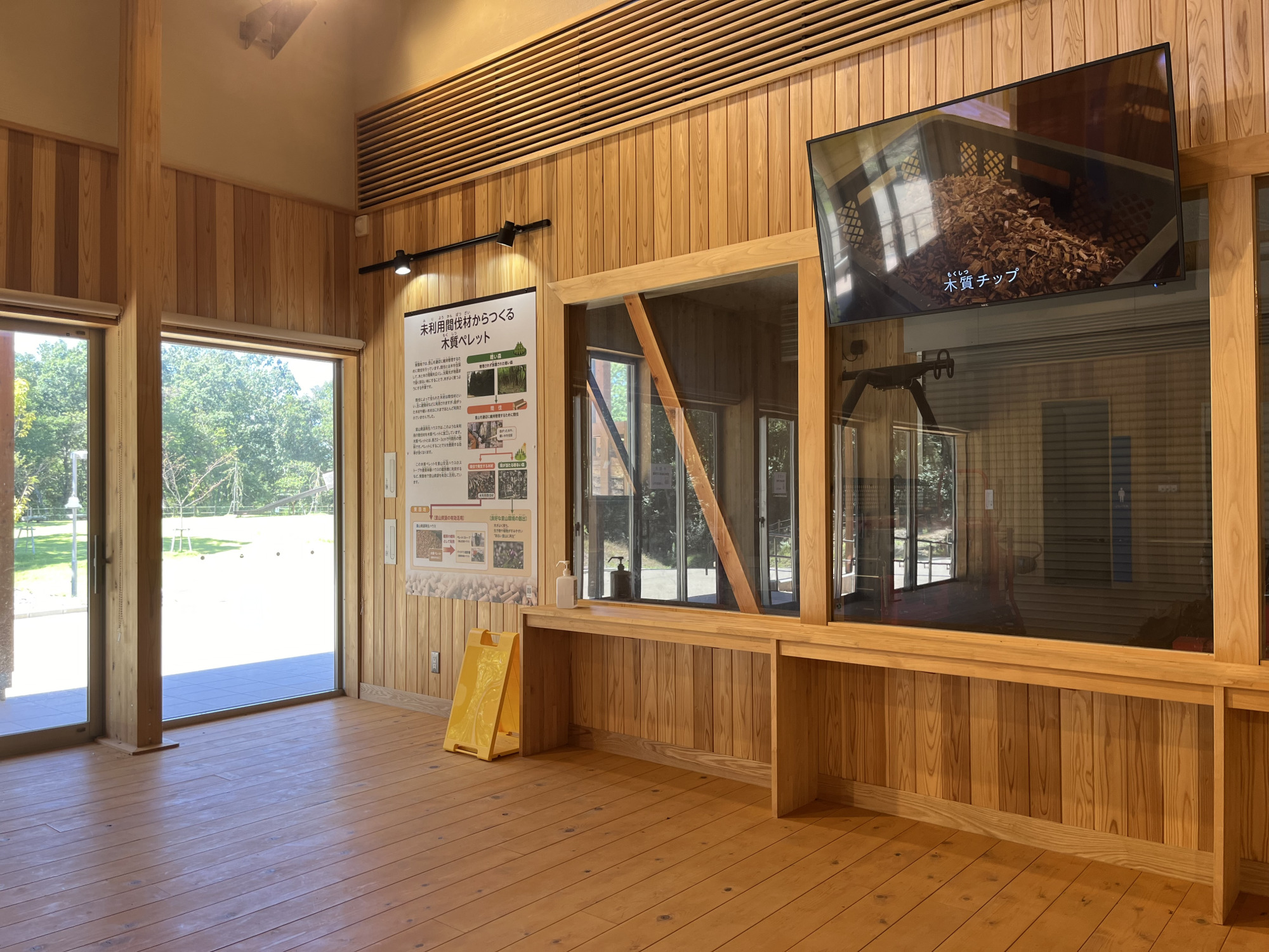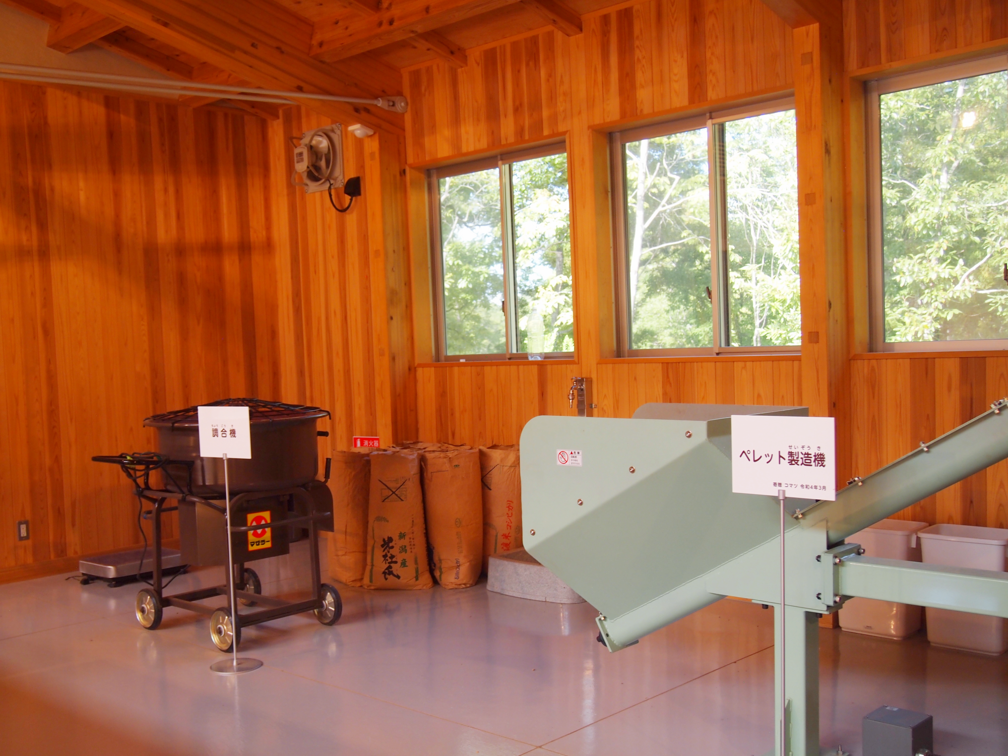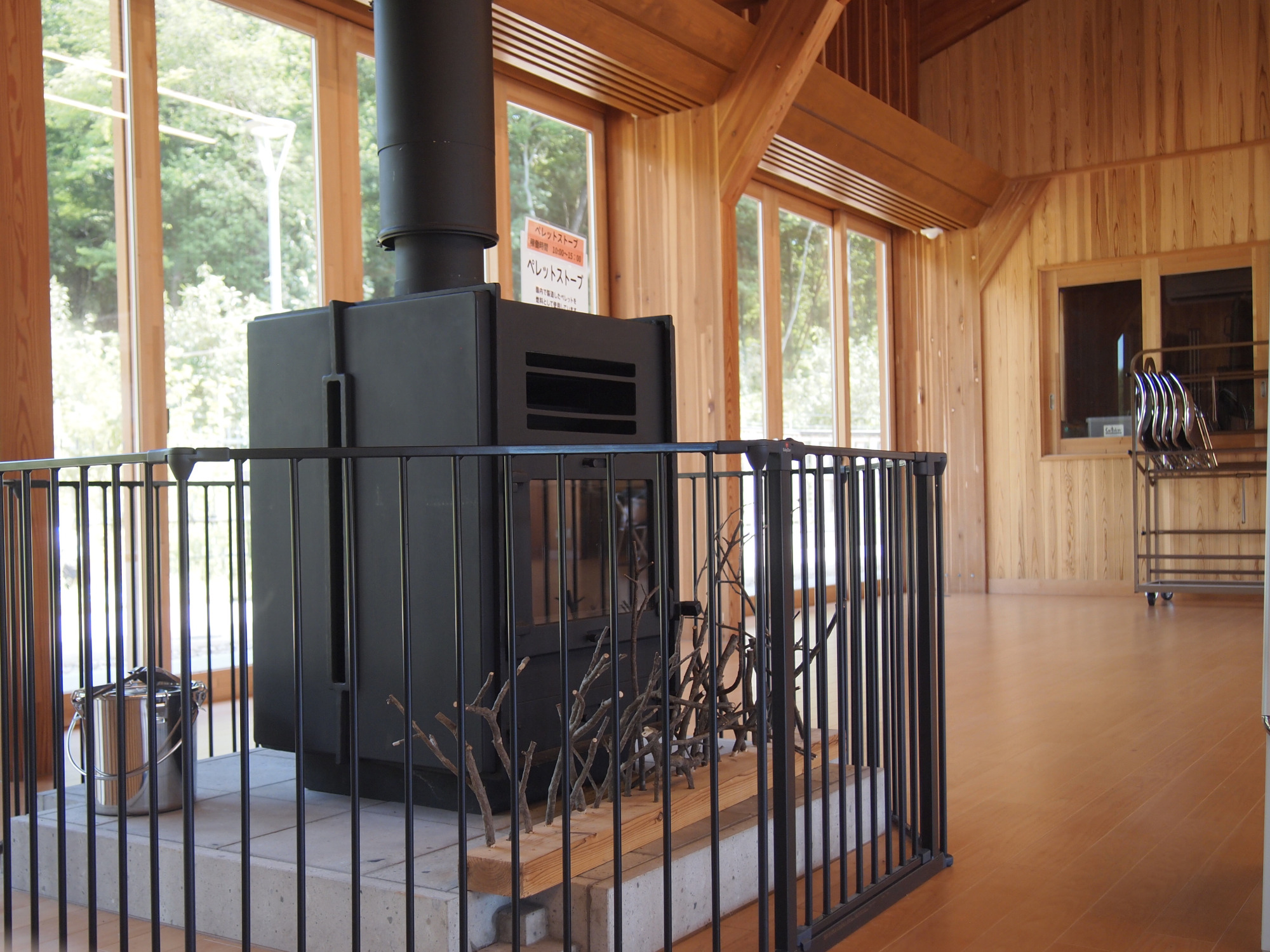 実際、レストルーム、多目的ルーム(里山交流ハウス内)にペレットストーブがあり火力として使用しているとのこと。