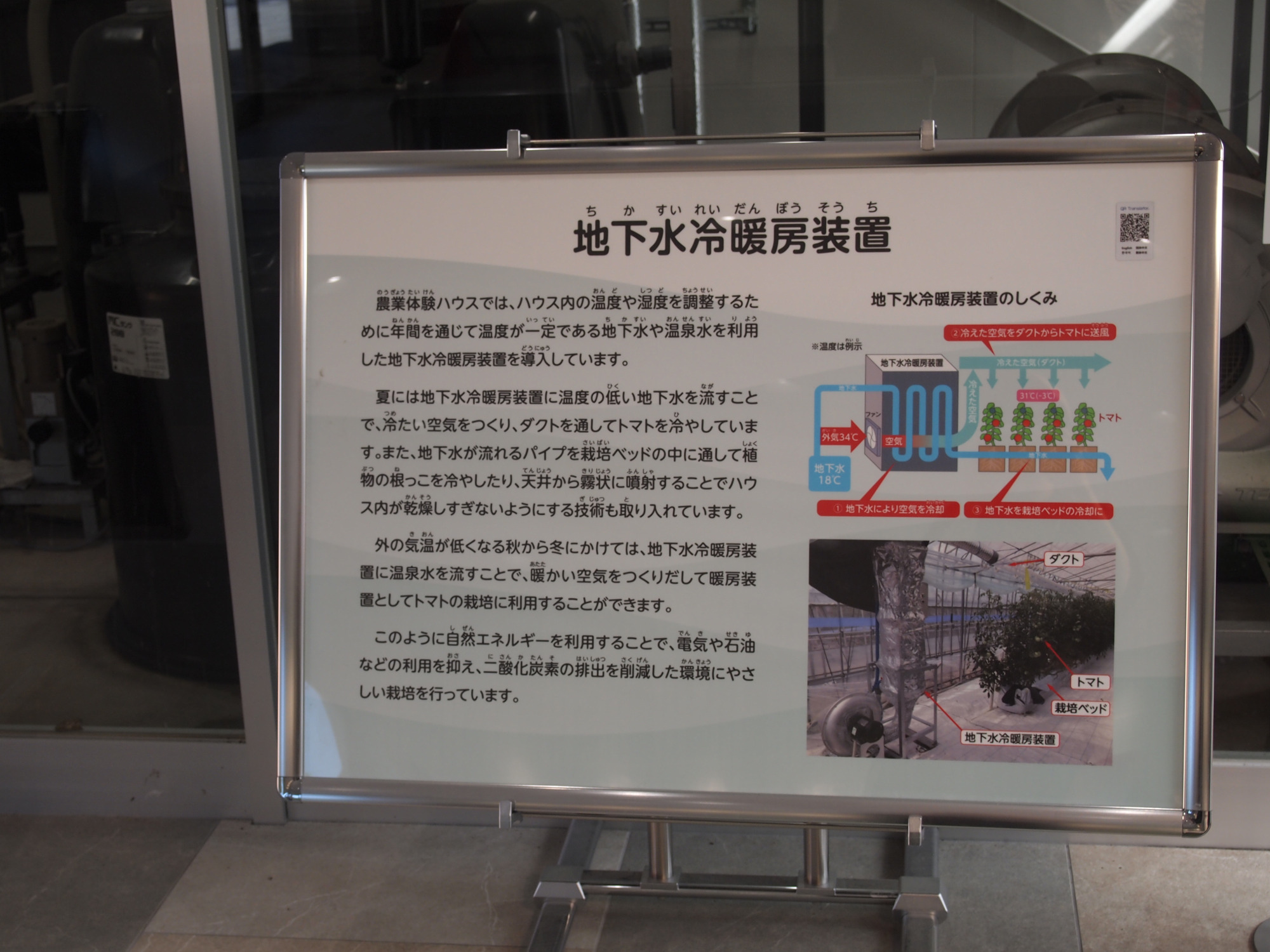 「太陽光発電装置」での温度管理や、「地下水冷暖房装置」で冷やす再生可能エネルギーと余すことなく利用しているのが入口でわかりやすく説明しています。