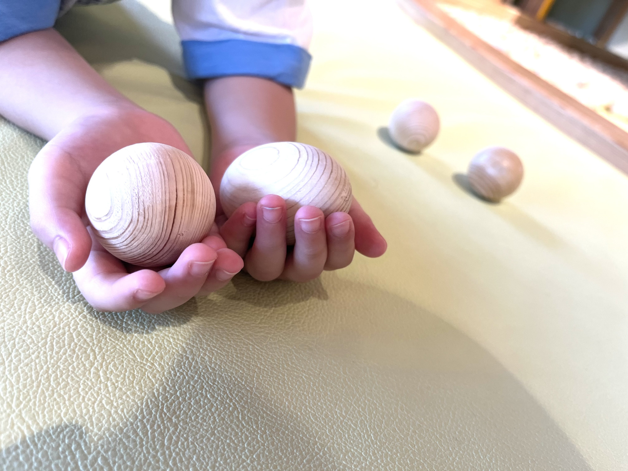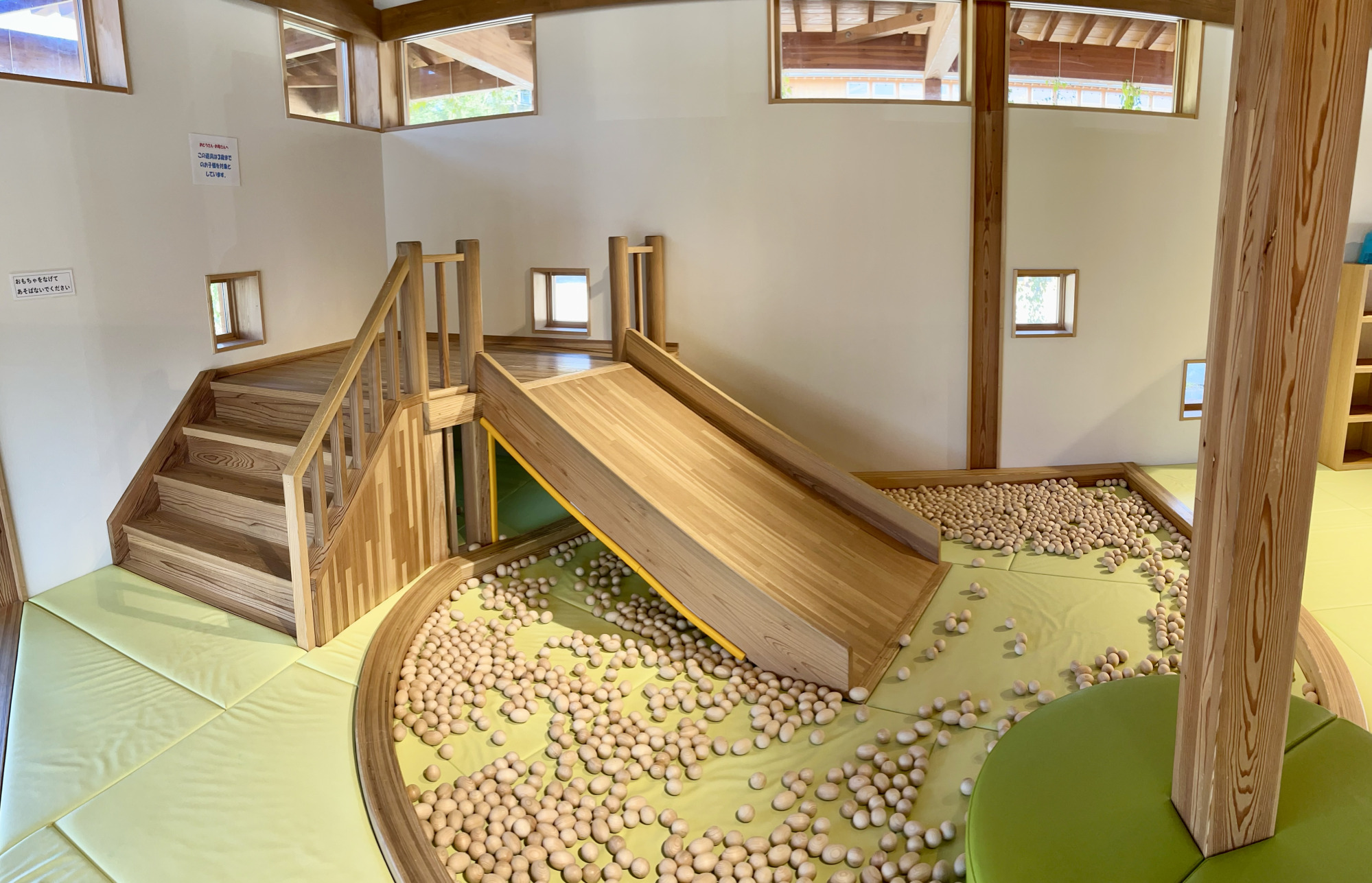 木のたまごは木育によく見かけますね。クッション材を使用した床なので優しく滑り台の下も潜り込めるので、ちょっとワクワクも・・・。