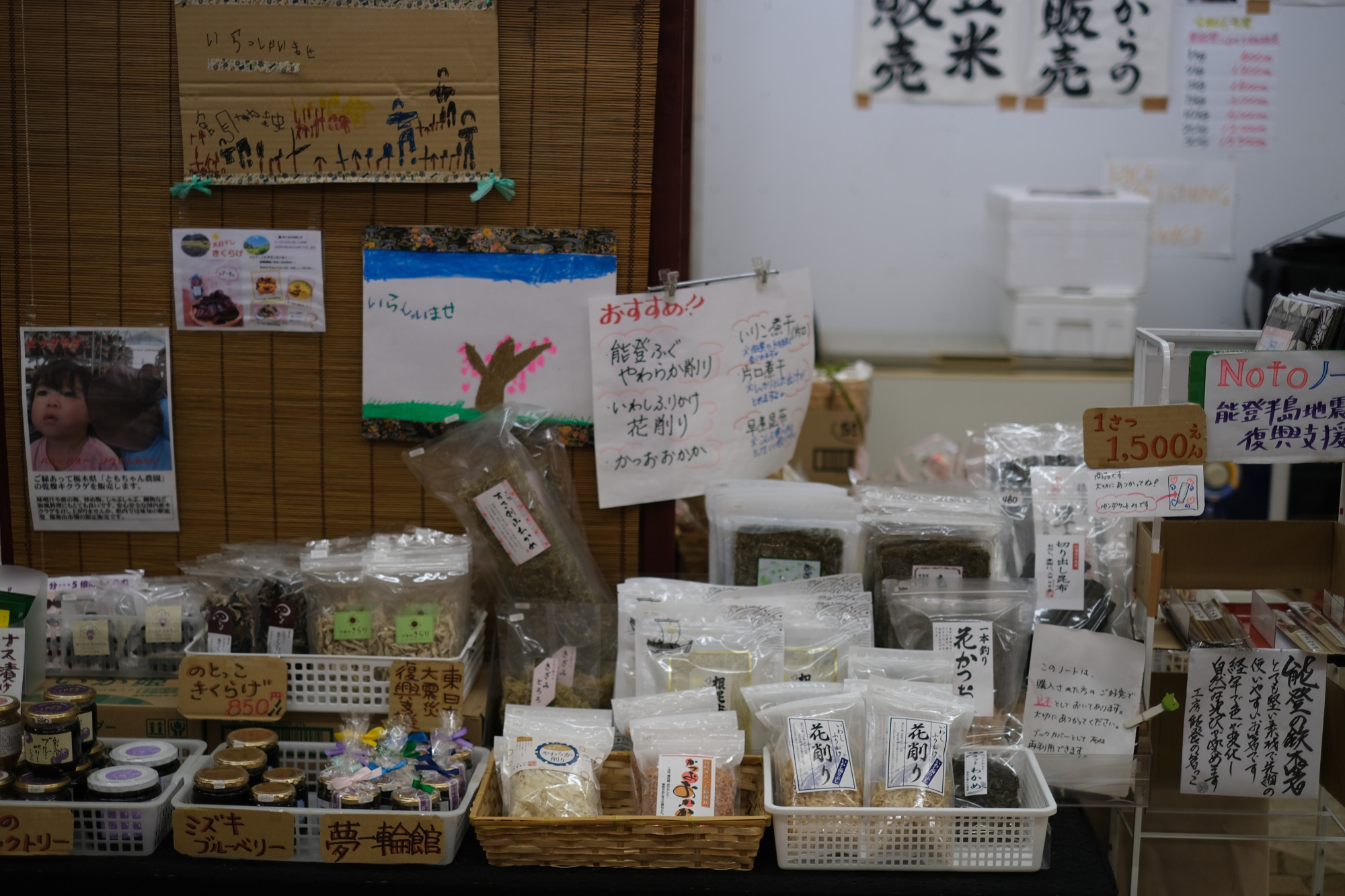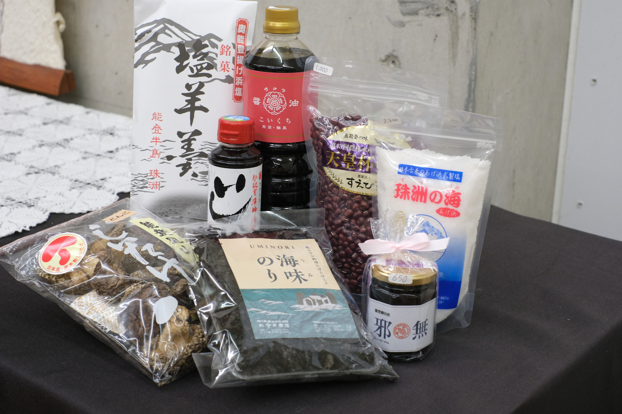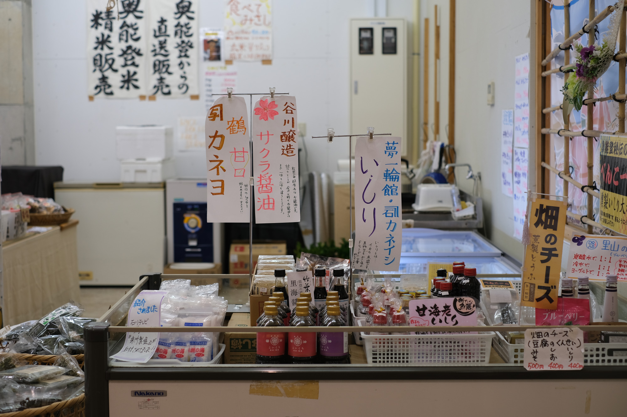 輪島の谷川醸造さんのサクラ醤油、珠洲の揚げ浜塩、能登大納言あずき、乾燥海苔、干し椎茸、ブルーベリージャム、塩羊羹、いしりなど、広い店内には、能登の名産品が並びます。