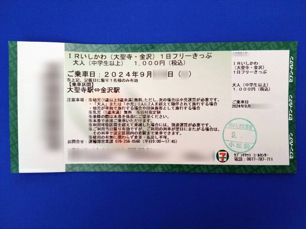1日フリーきっぷは、加賀温泉、小松、松任、金沢、津幡のIR各駅窓口や、マルチコピー機が設置されているセブンイレブン店舗、セブンチケットサイトで購入することができます。