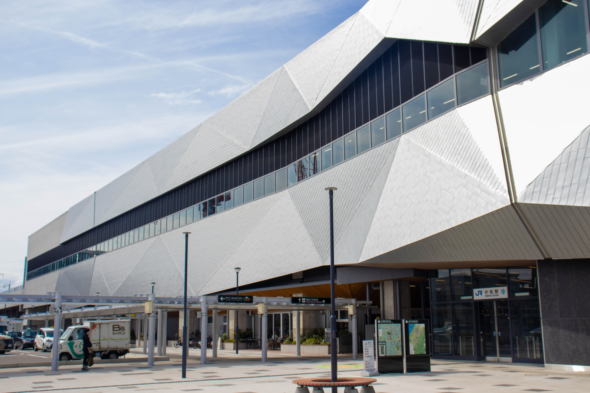 小松駅の東口を出ると、真っ白でスタイリッシュなデザインが新幹線駅舎が目を引きます。