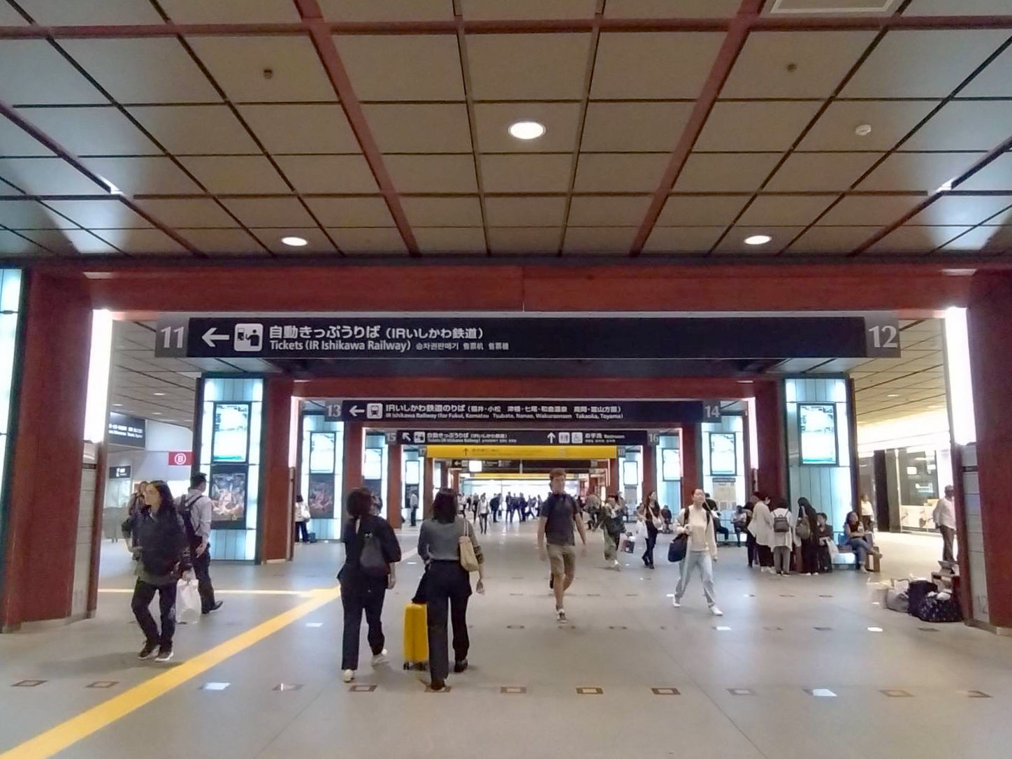 もてなしドームをくぐると、金沢駅の入り口が見えてきます。奥行きを感じる、広々とした空間ですね。天井や壁にも石川県の伝統工芸が惜しみなく使われています。