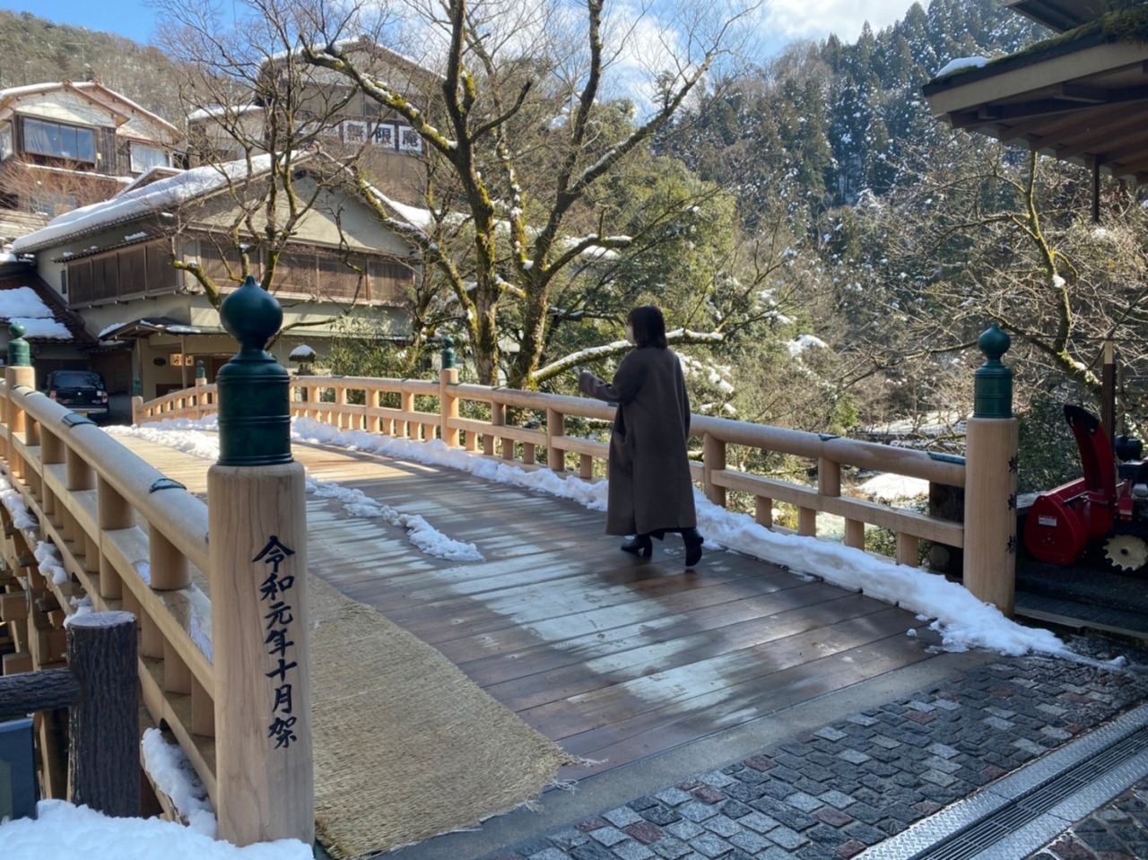 「こおろぎ橋」は、鶴仙渓に架かる総ヒノキ造りの風雅な橋です。山中温泉を代表する名勝で、こおろぎ橋から眺める鶴仙渓も文句なしの絶景。2019年10月に、新しい橋への架け替えが終わったそうで、新生のこおろぎ橋を渡ることができました!