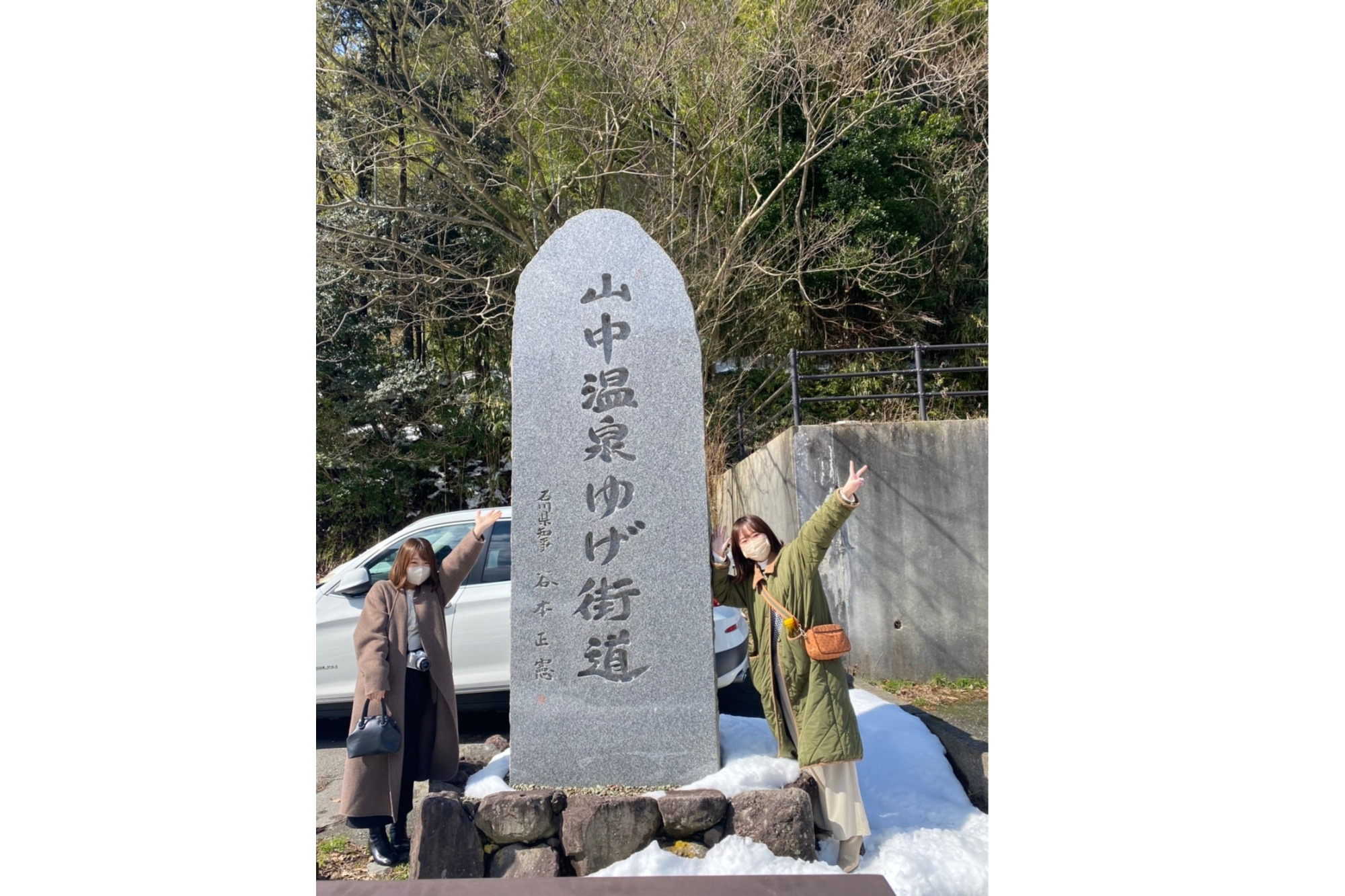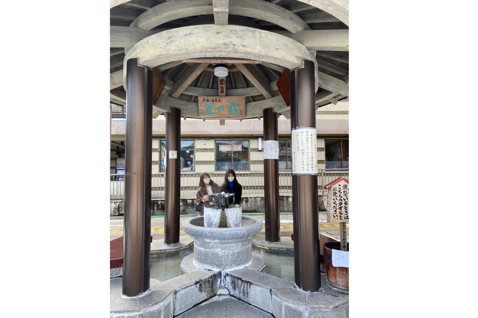 ゆげ街道を歩いていると、山中温泉総湯の「菊の湯」を発見!男性浴場前の温泉たまごゆで処では、温泉たまごづくり体験もできるのだとか。また近くには、足湯やフォトスポットも!記念にパシャリと写真を撮りました♪