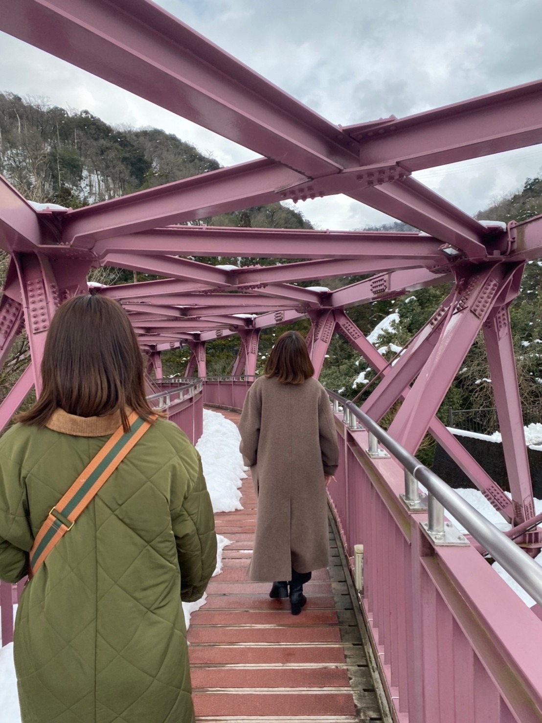 「あやとりはし」は、ユニークなS字型の橋です。他に類のない形状と美しい紅紫色のモダンさに目を引きます。