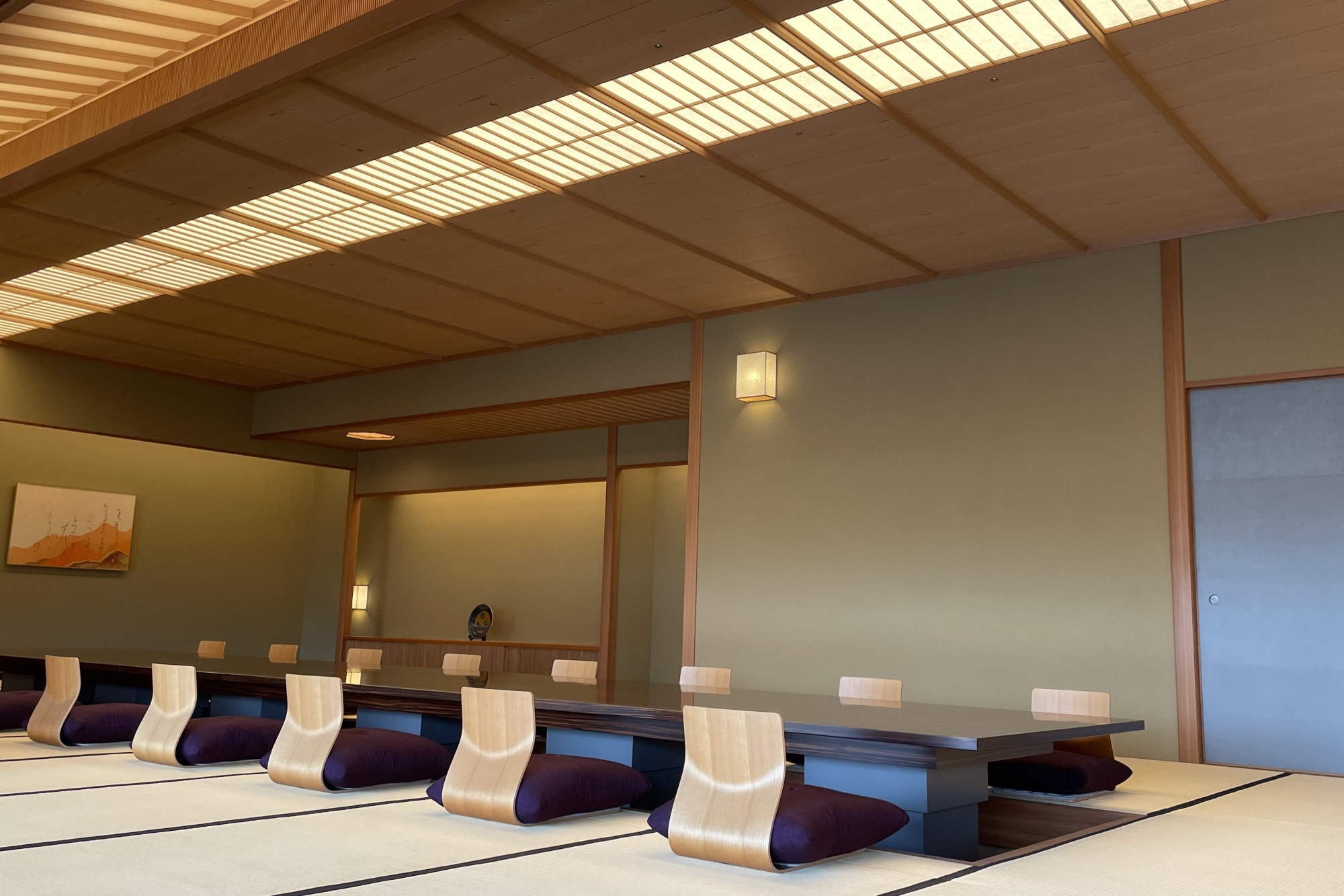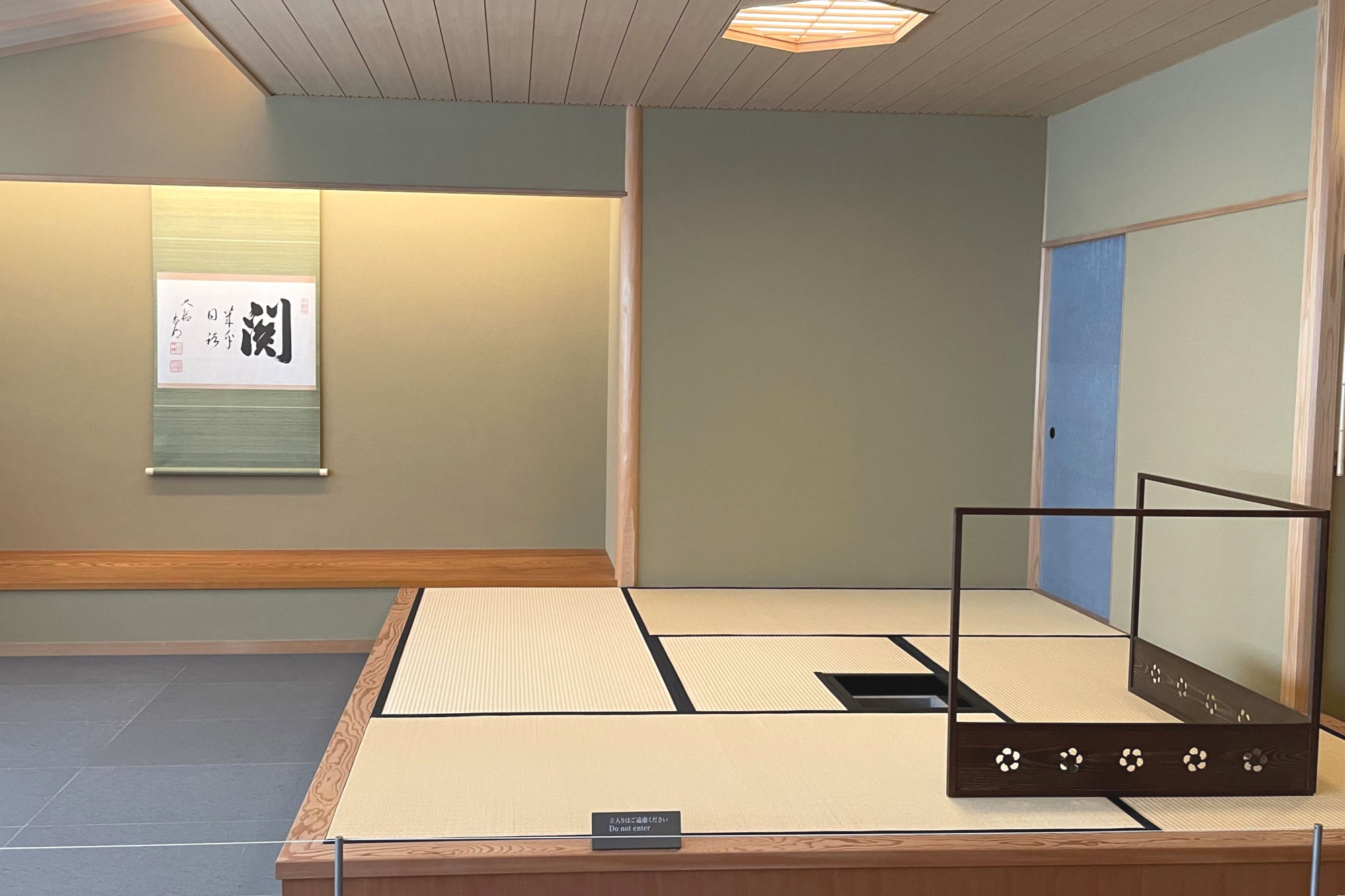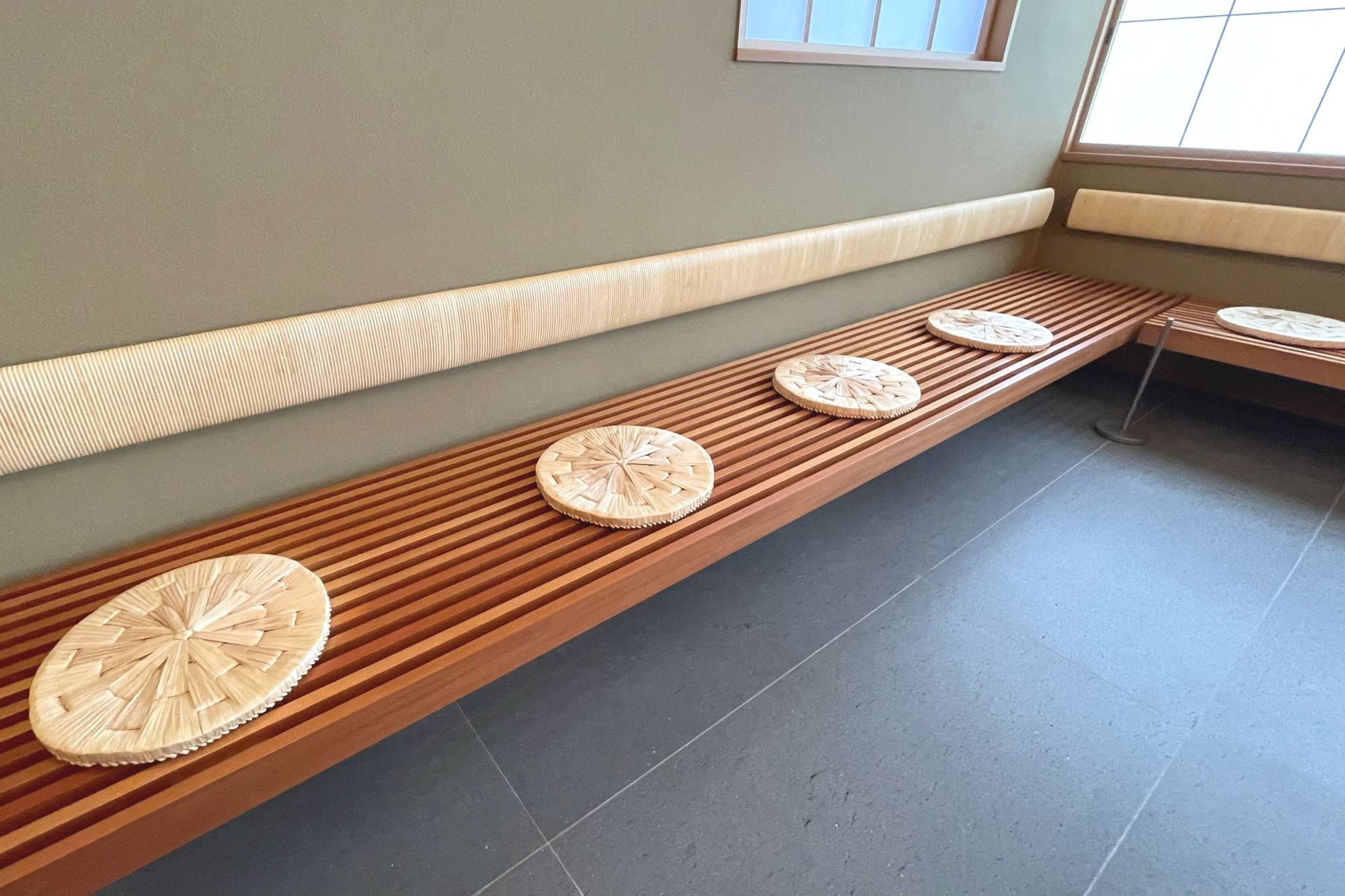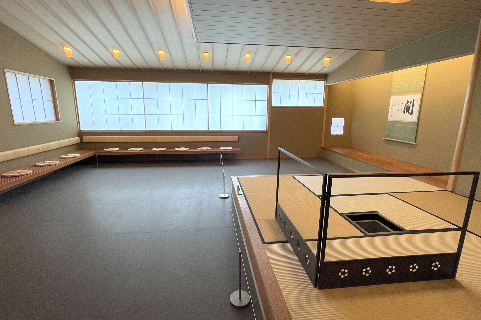 茶室は伝統的な様式とは少し違った趣き。左手から奥にかけてベンチ式の席があります。これは海外の方がゲストとして無理なく楽しめるようにと設計されたものなんだそう。