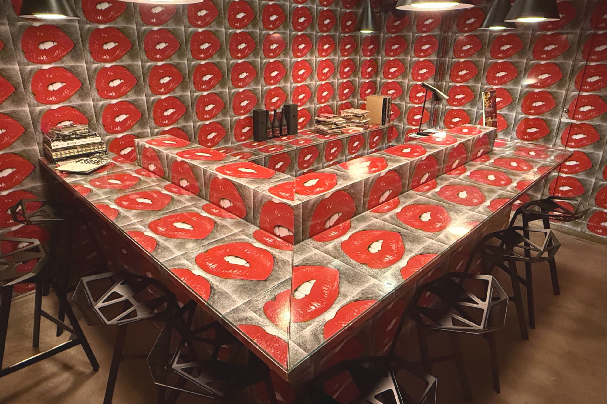 地図を見ながらたどりついたのが謎のBAR。空間を埋め尽くす赤い唇の写真はインパクト大!この《Lip Bar》は、写真家・森山大道が手掛けたもので、室内の内側を真っ赤なリップが覆いつくすインスタレーション作品です。