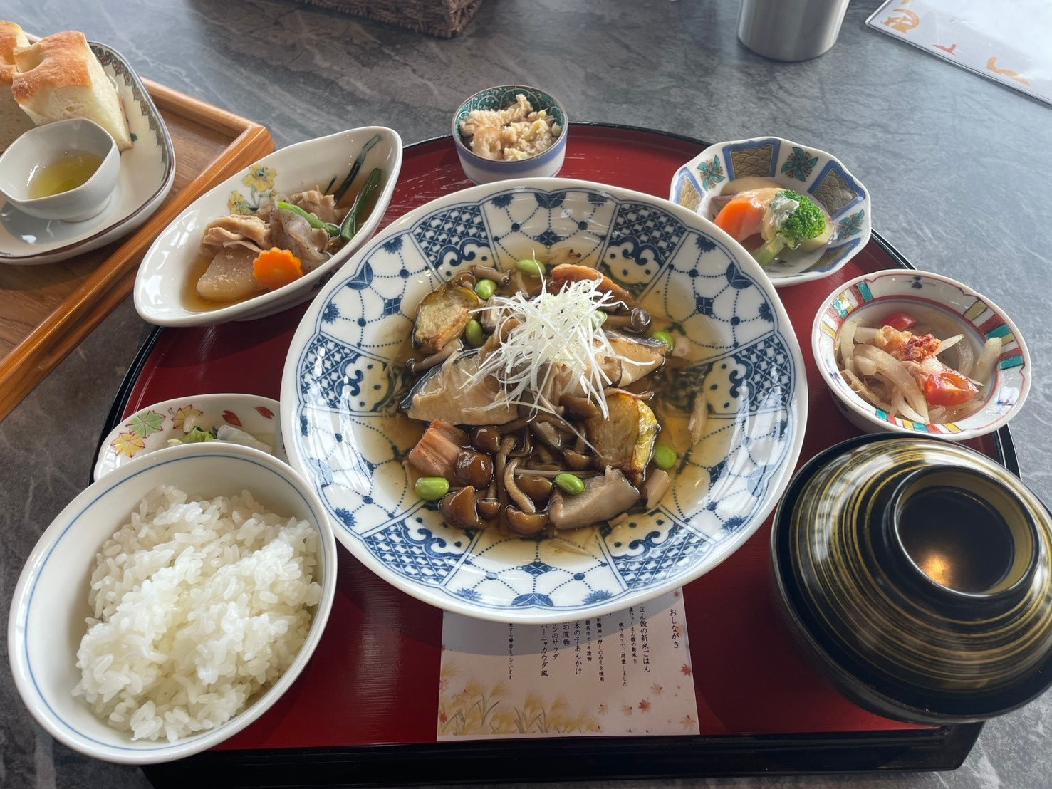 「さらい定食」は、和食ランチ。旬の地元食材がふんだんに使用されており、どのおかずもごはんにぴったり!新米ごはんがぱくぱく進みます。