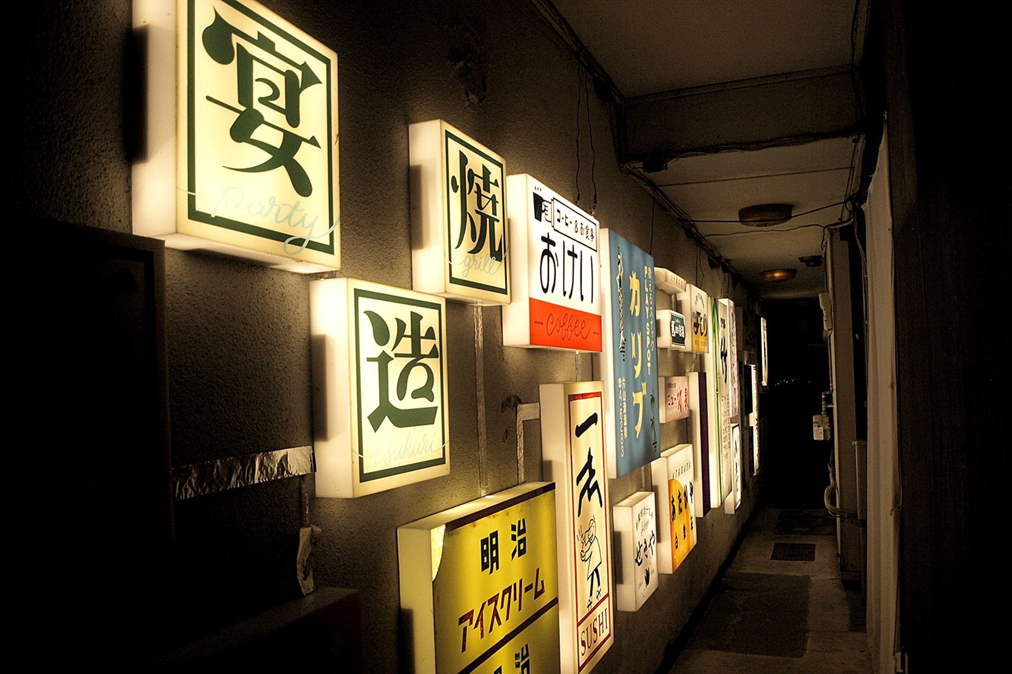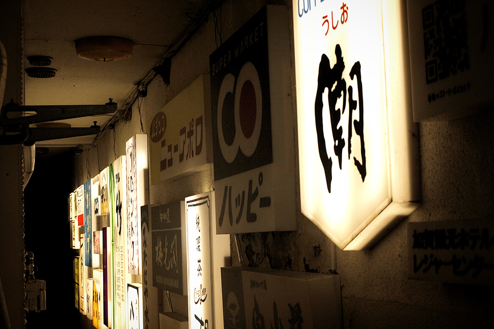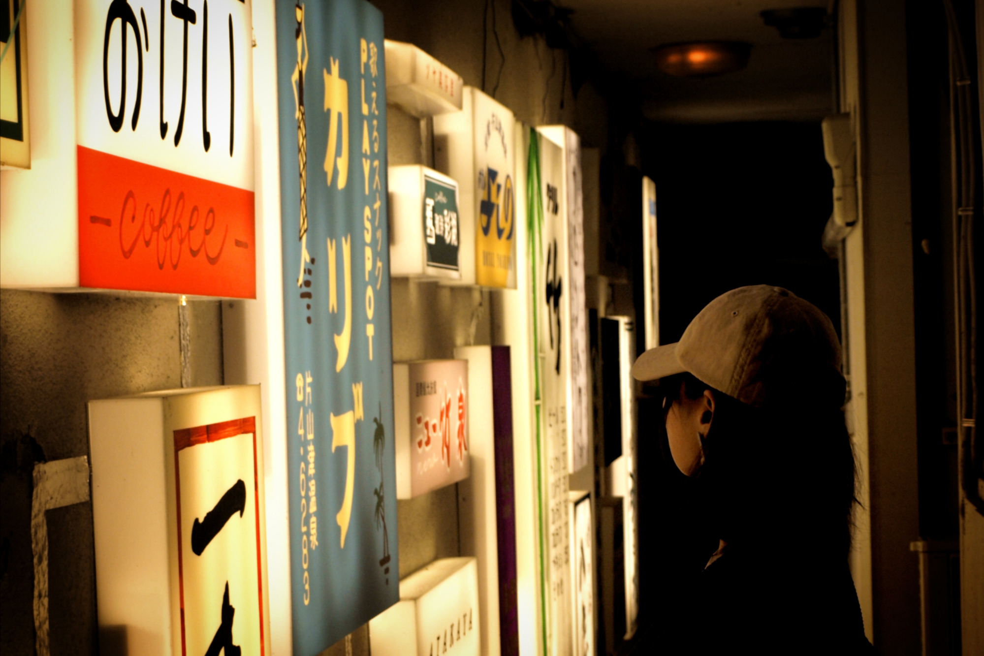 様々な飲食店の看板が、懐古的でノスタルジーを演出。