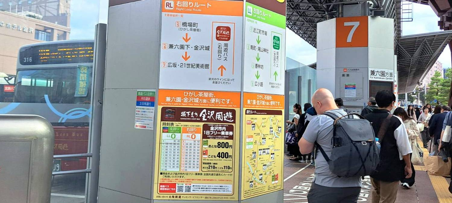 おすすめは、金沢駅を起点に主要な観光地を循環する「城下まち金沢周遊バス」。約15分間で運行し、金沢駅からひがし茶屋街、兼六園など網羅しています。この日も多くの観光の方が乗車していました。