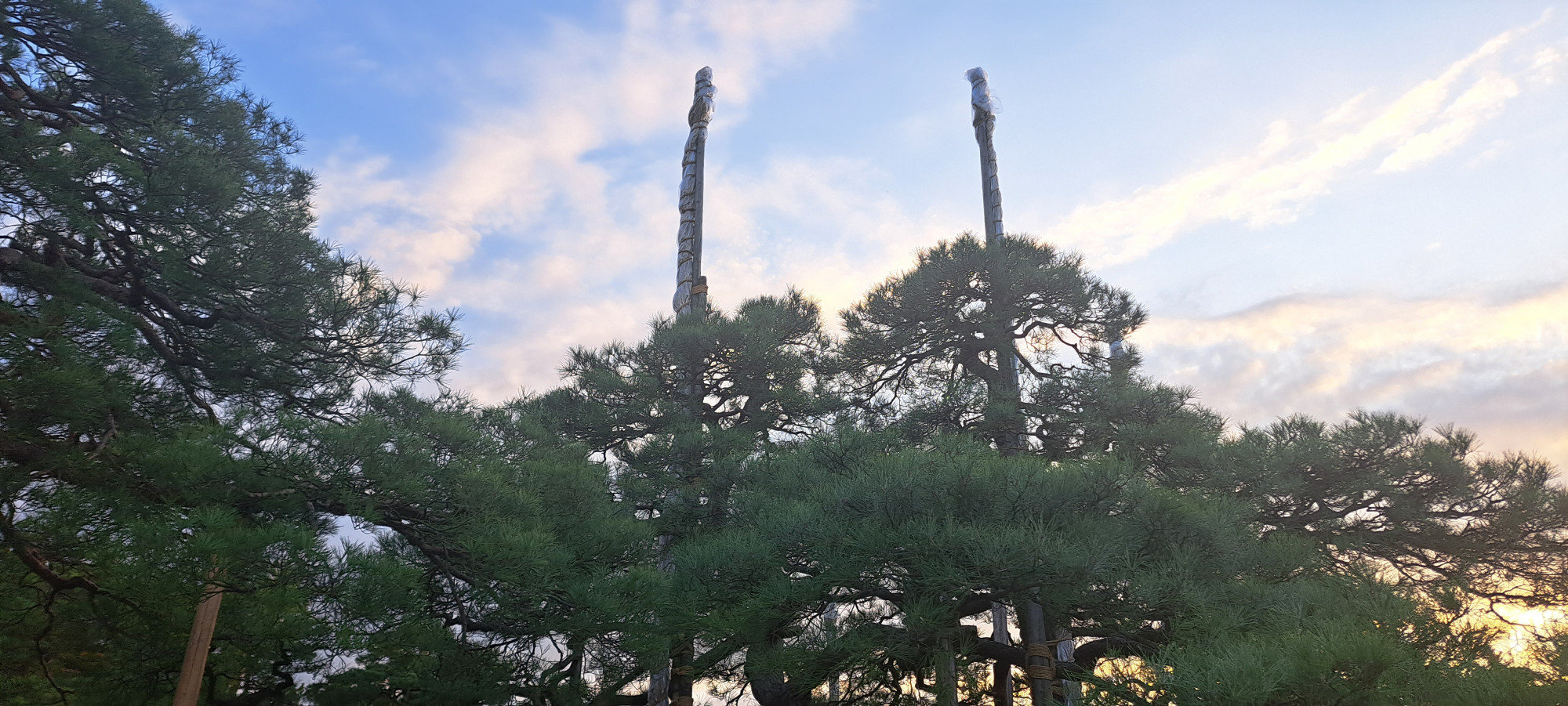桜、カキツバタ、紅葉、雪吊りと春夏秋冬それぞれの景色が楽しめます。訪れた10月末は、ちょうど雪の重みで木が折れないように支える雪吊りの準備中でした。