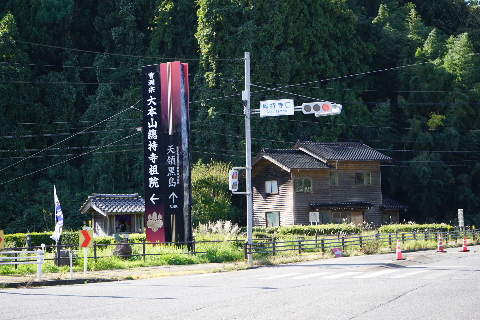 国道249号線からすこし入った場所にある大本山總持寺祖院。基本的なアクセスは車が便利。のと里山海道穴水I.C.から約25分、のと里山空港から約30分。金沢(南西)方面から、そして輪島市街地やのと里山空港(北東)方面からと、どちらからきても国道沿いに同じ大きな案内看板がでているのでわかりやすいです。国道からはどちらから入っても3分程度。