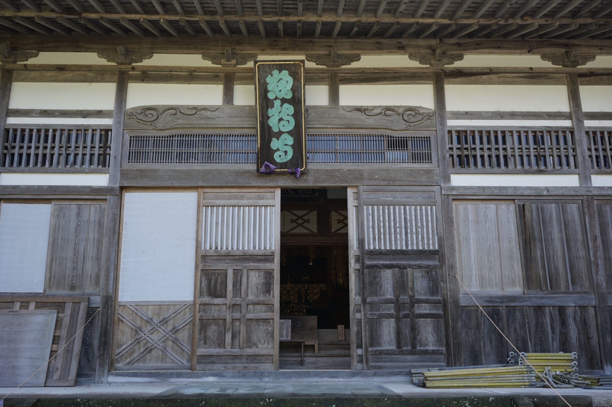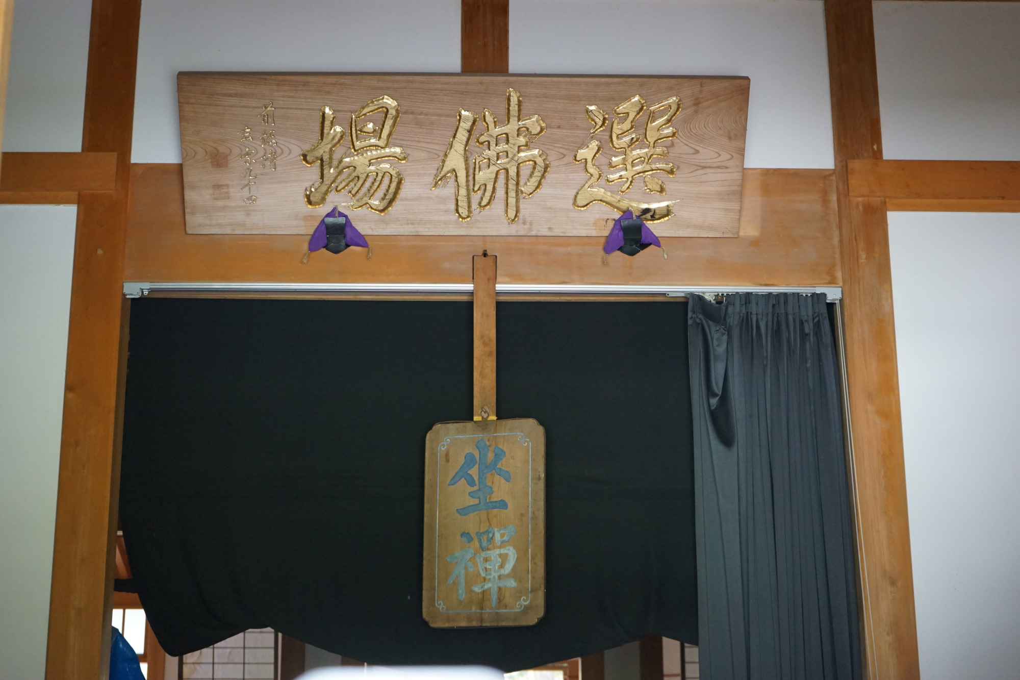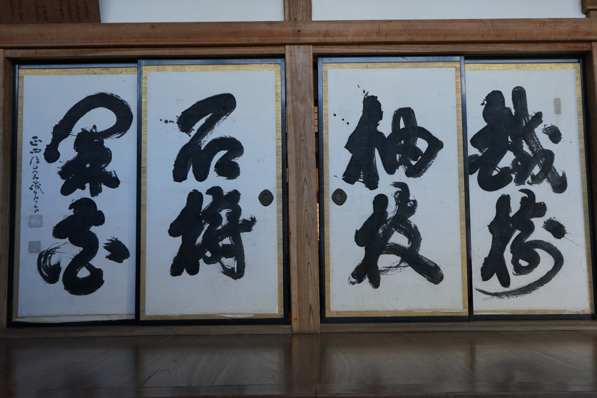 仏殿は入口まで入れます。入るとすぐに山岡鉄舟の書「襖四枚」があります。右から、