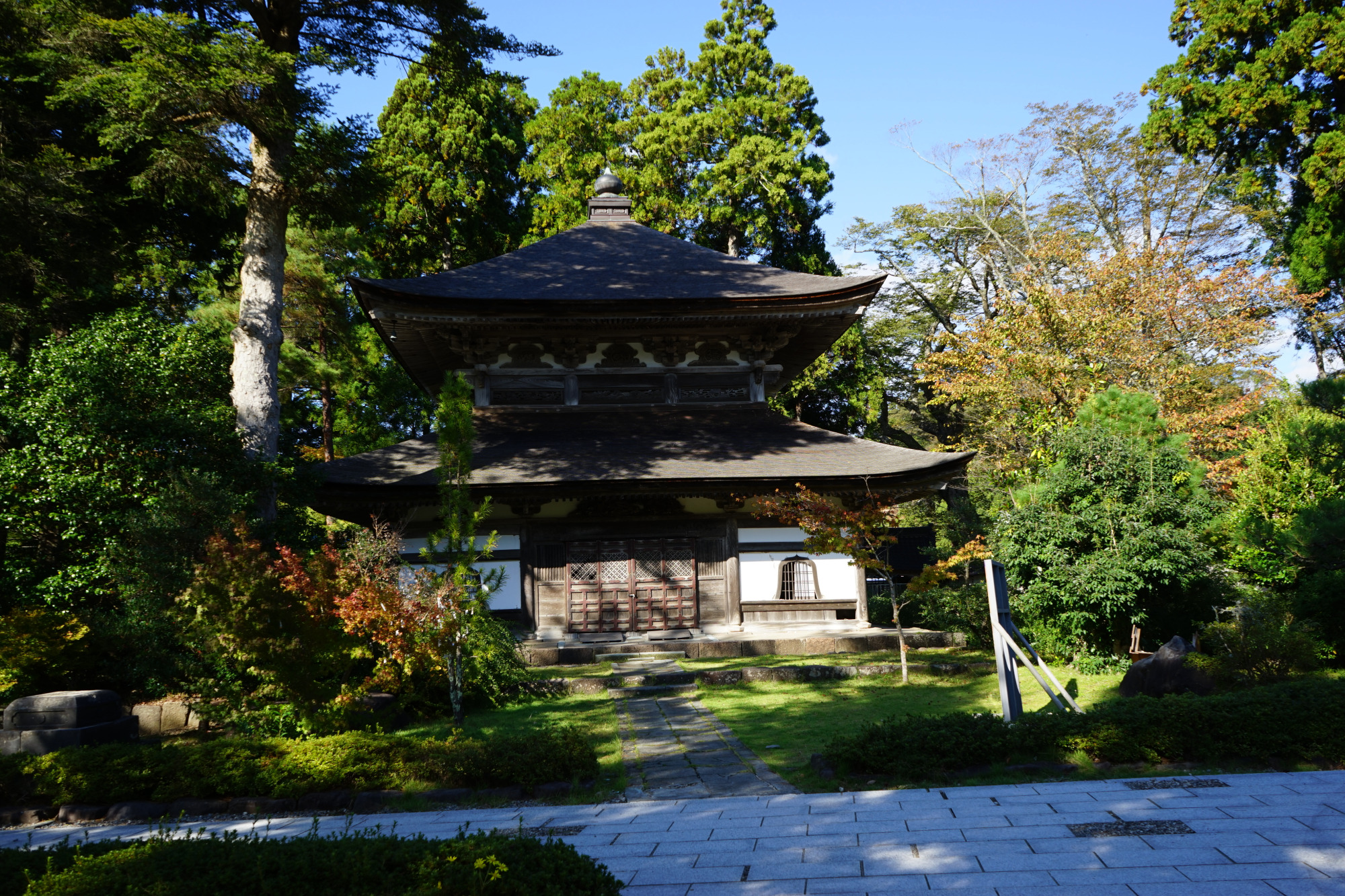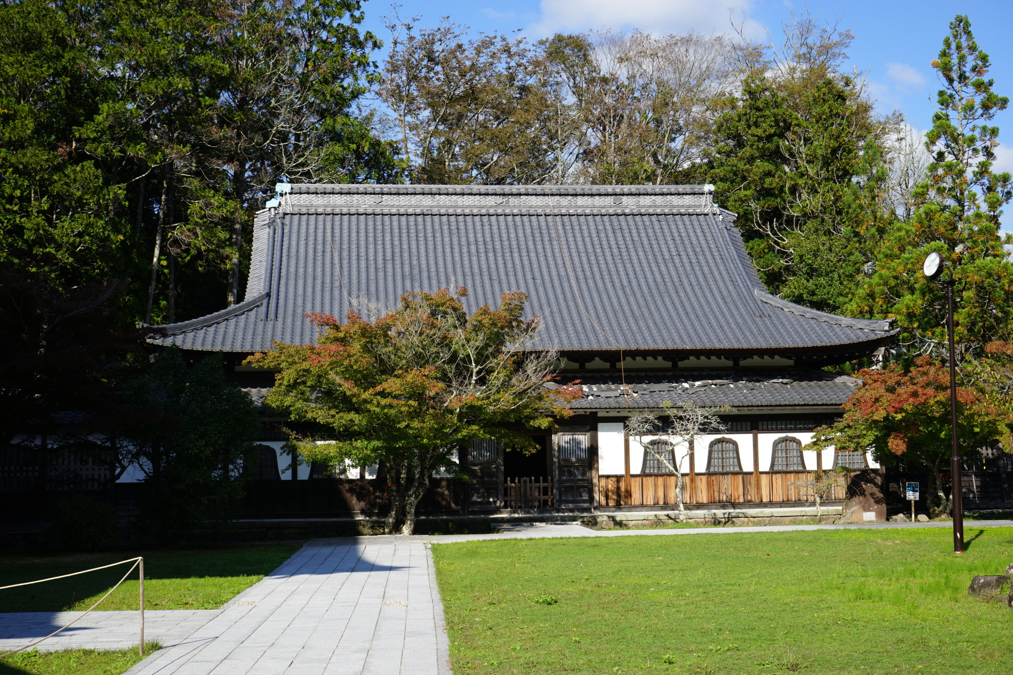 山門をくぐると、正面に大きな大祖堂。総檜、入母屋(いりもや)造りの大伽藍です。入母屋(いりもや)とは屋根の形状で、2面屋根の「切妻屋根」と、4面屋根の「寄棟屋根」の形状が組み合わされ、先が広がるデザイン。