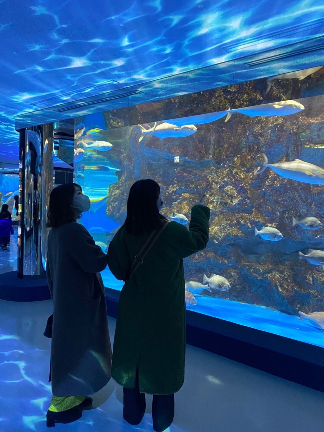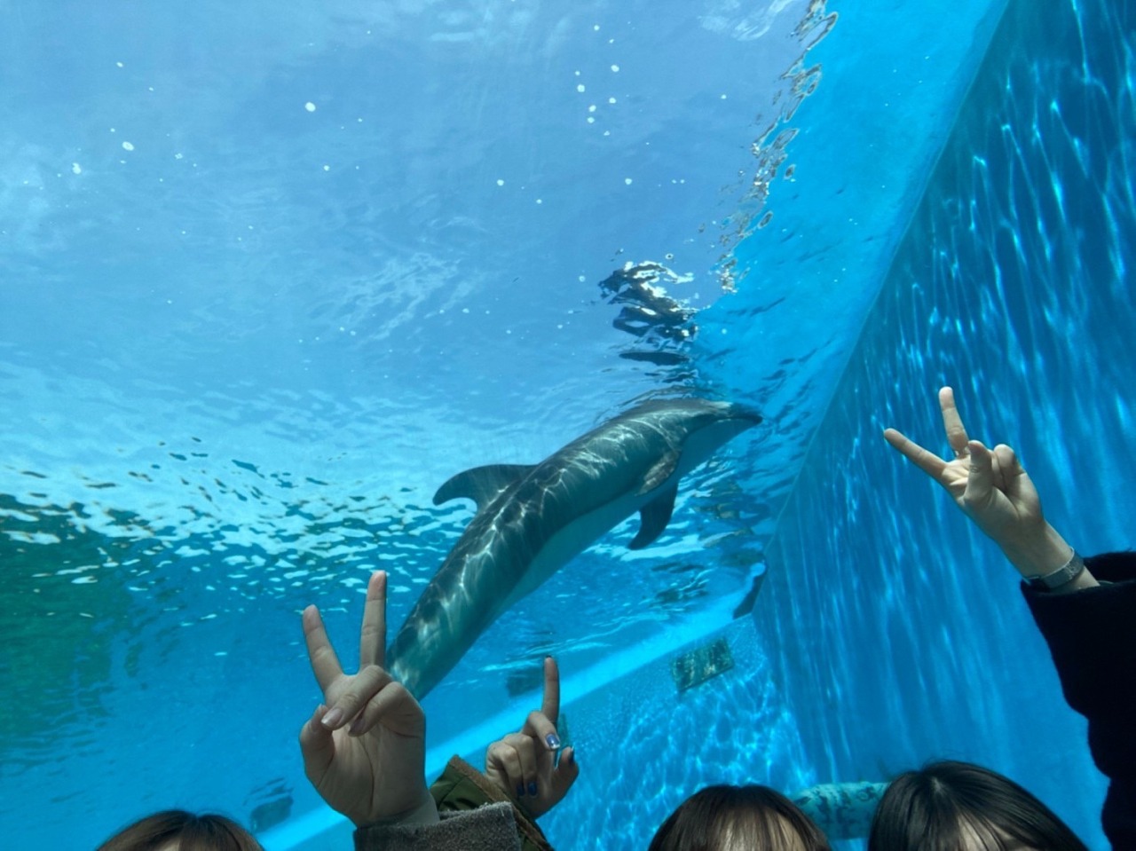 イルカとの写真を撮ろうとしていたら、水槽の上にいたイルカが下の方まで来てくれました~!3人で大はしゃぎ!