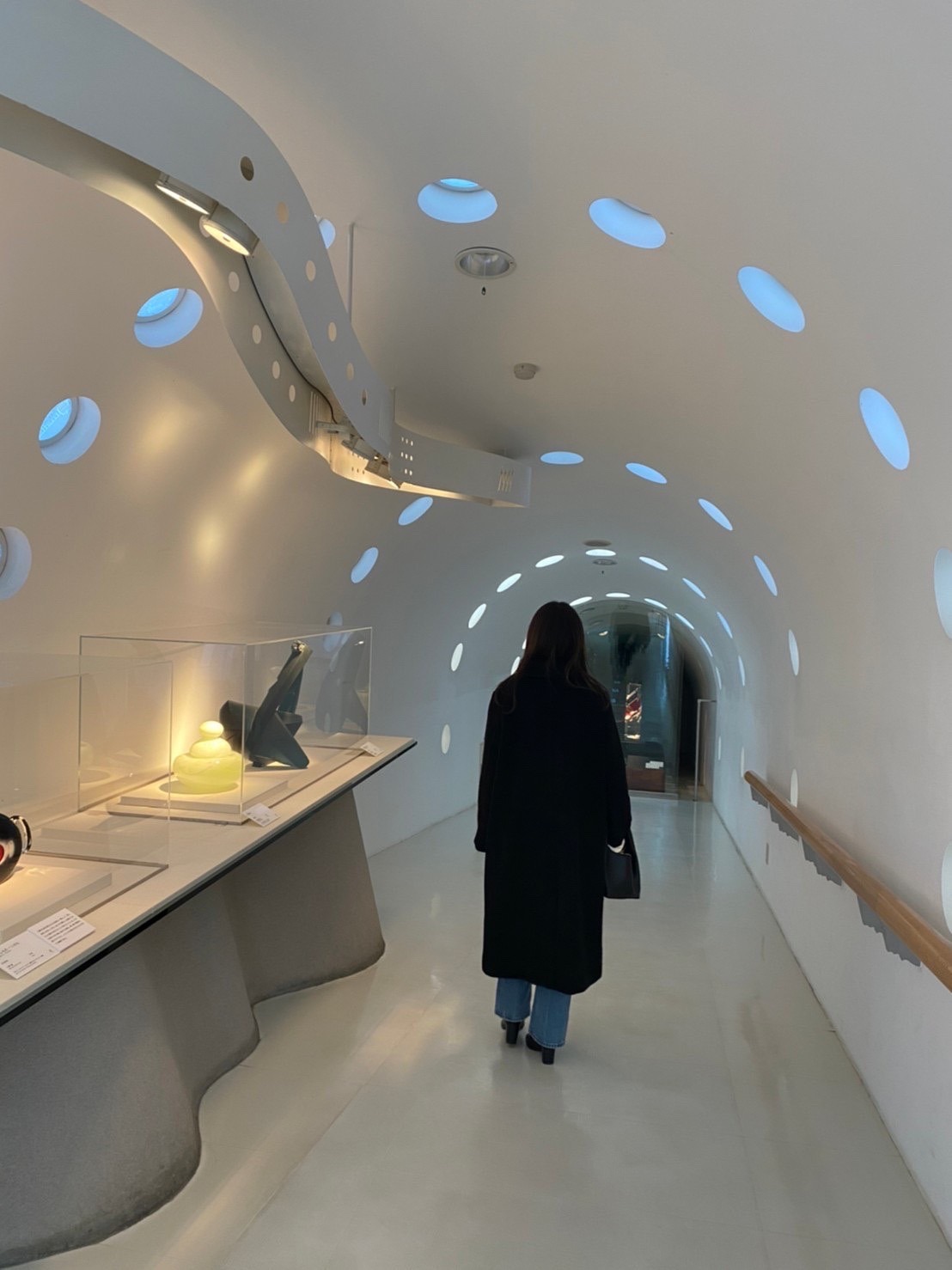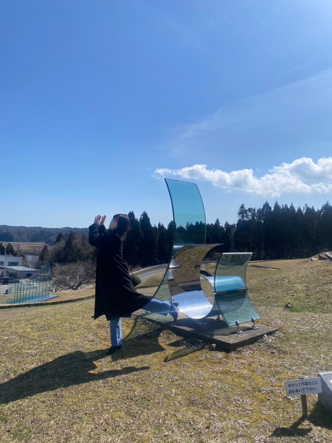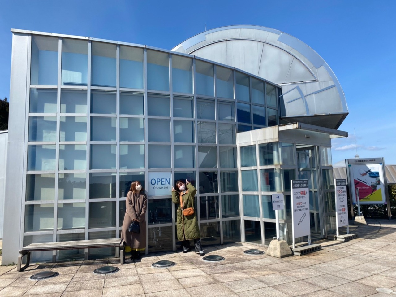 美術館の建物は、四神相応(東に青竜、西に白虎、南に朱雀、北に玄武)をもとに、四神を象徴する棟を四方に配した構造で、外観は、宇宙基地のようなデザインになっています。豊かな自然に囲まれ、青空の中にひときわ目立つ建物です♪