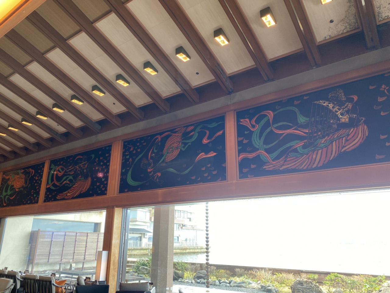 例えば、能登渚亭の1階から12階までの吹き抜け一面にわたる加賀友禅は、金沢の作家、梶山伸氏によるものだそうです。ガラス張りのエレベーターから眺めることができ、豪華絢爛な加賀友禅に思わず心を奪われます。