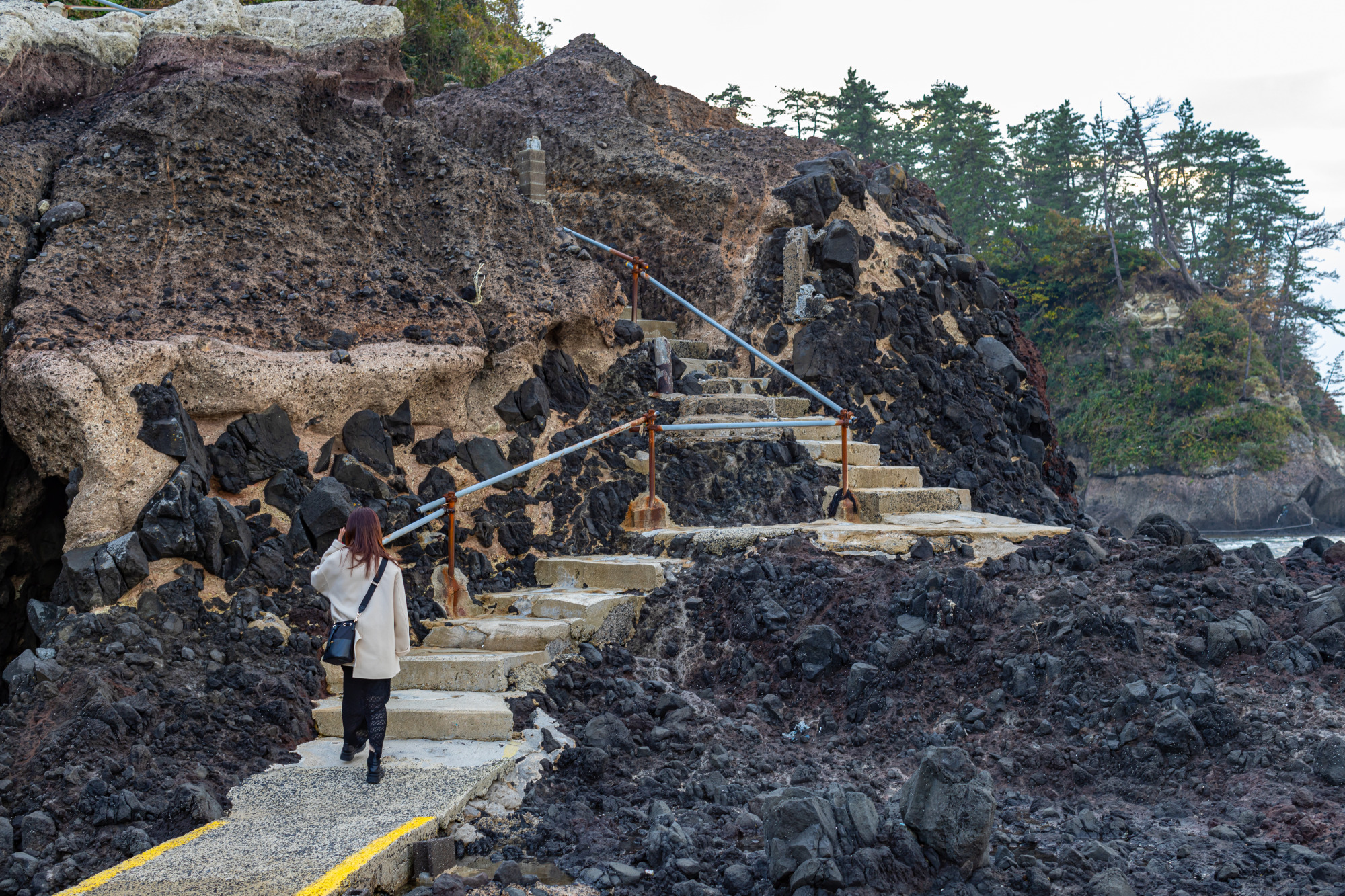 この岩場周辺は独特の岩の形、色をしており、下に降りて歩くこともできます。