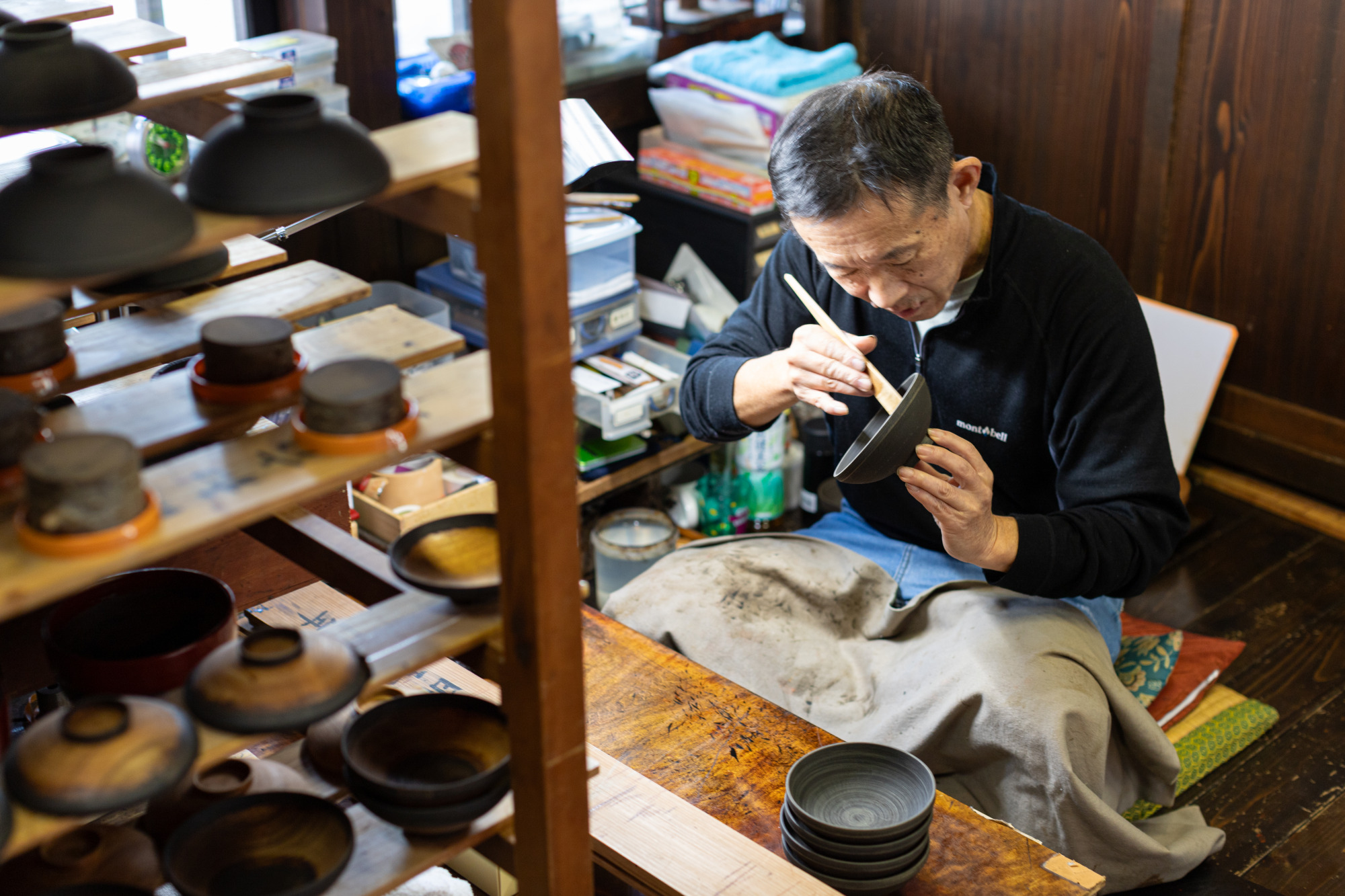 珪藻土を用いた粉を漆に混ぜ、何度も塗り重ねる事で厚みができ頑丈になり、また仕上がり時の肌が綺麗になるのが特徴です。