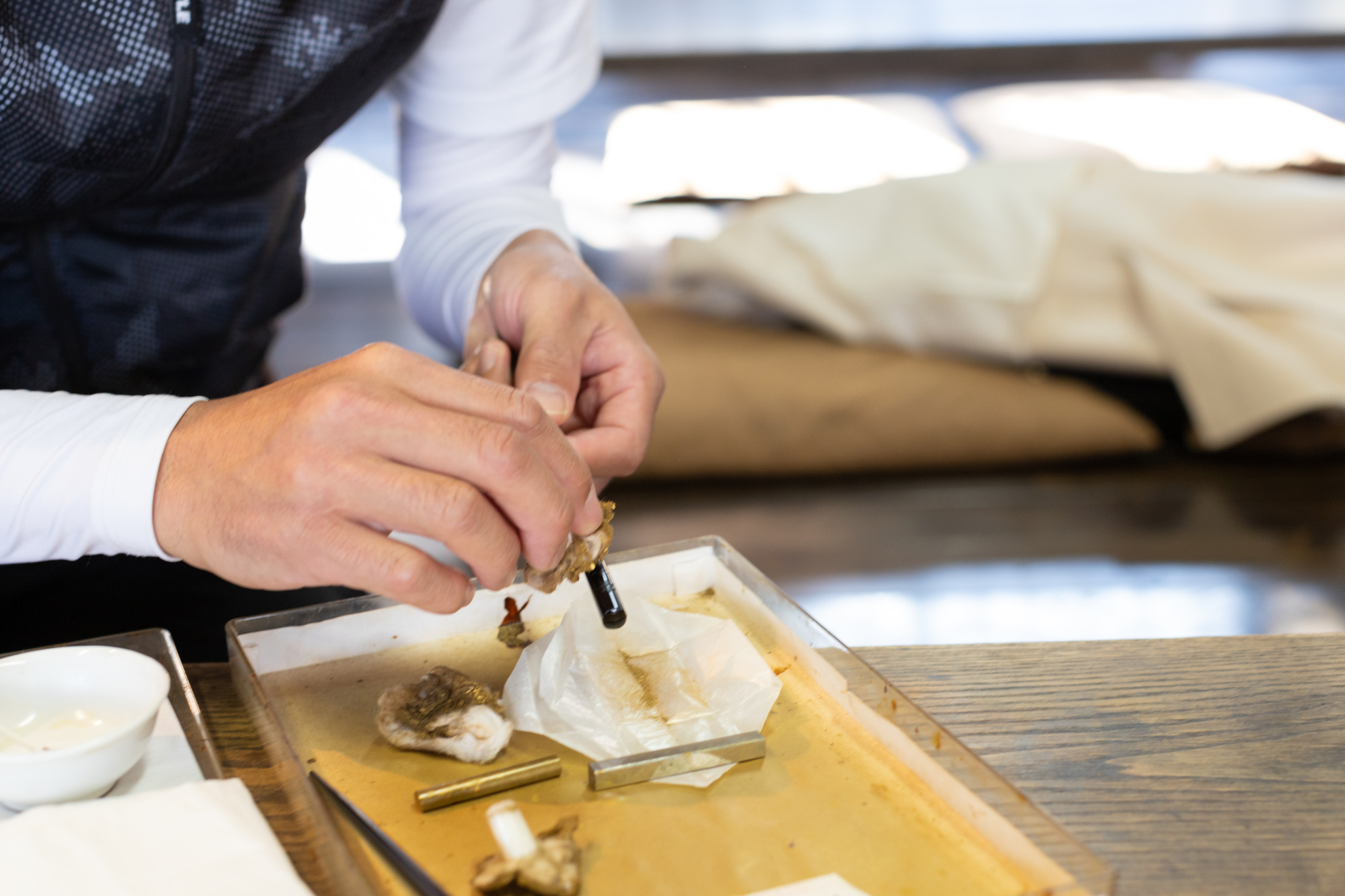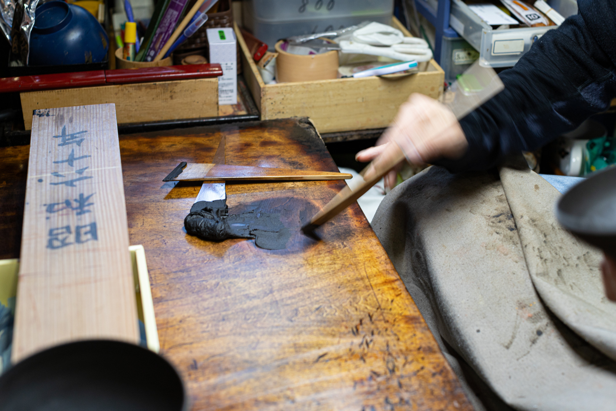 まずは「下地」職人さんの永井さんからお話を伺い、また実際に漆を塗っているところを拝見しました。