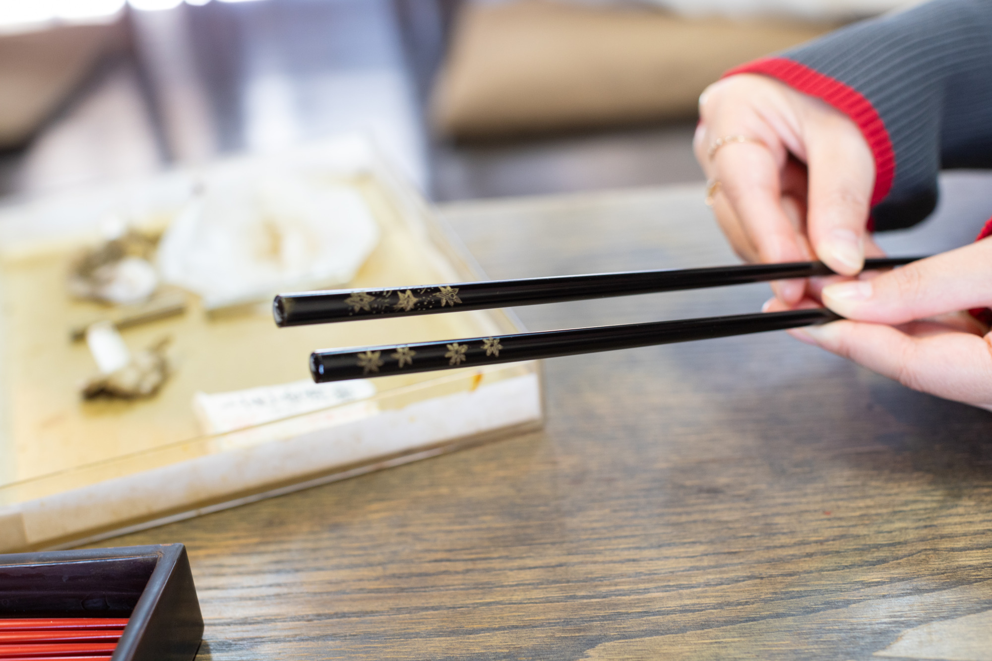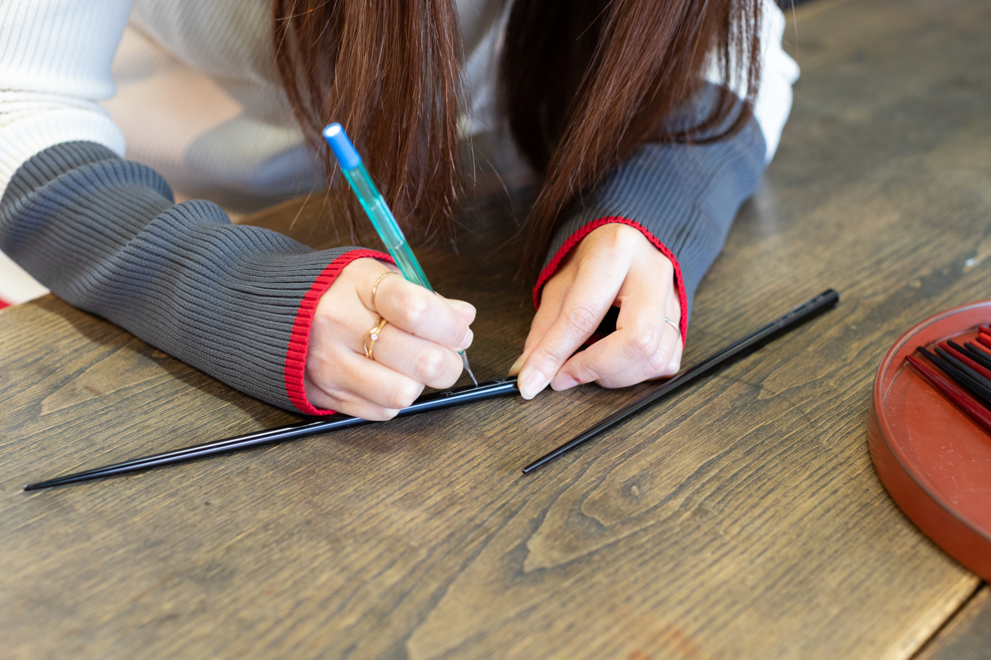 実際の輪島塗の箸に「沈金」(ちんきん)か「蒔絵」(まきえ)の装飾方法を選ぶことができます。
