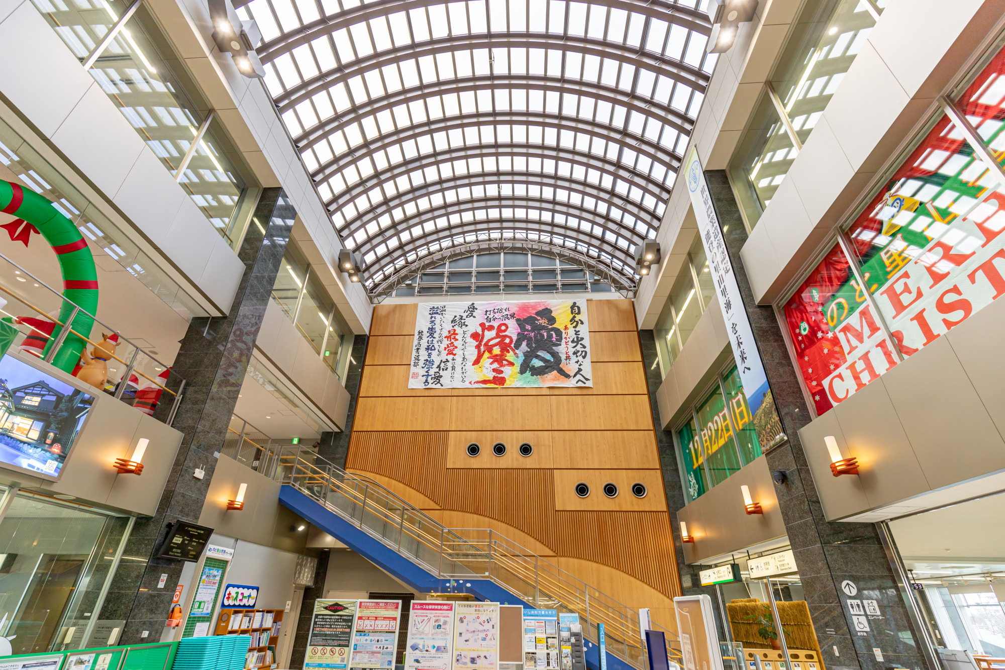 右側のエスカレータを乗り継ぐと2階には天井の高いホールがあり、一面のガラス窓から光が降り注ぎます。