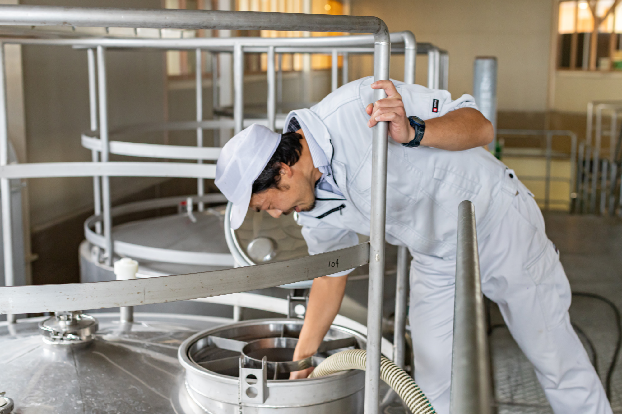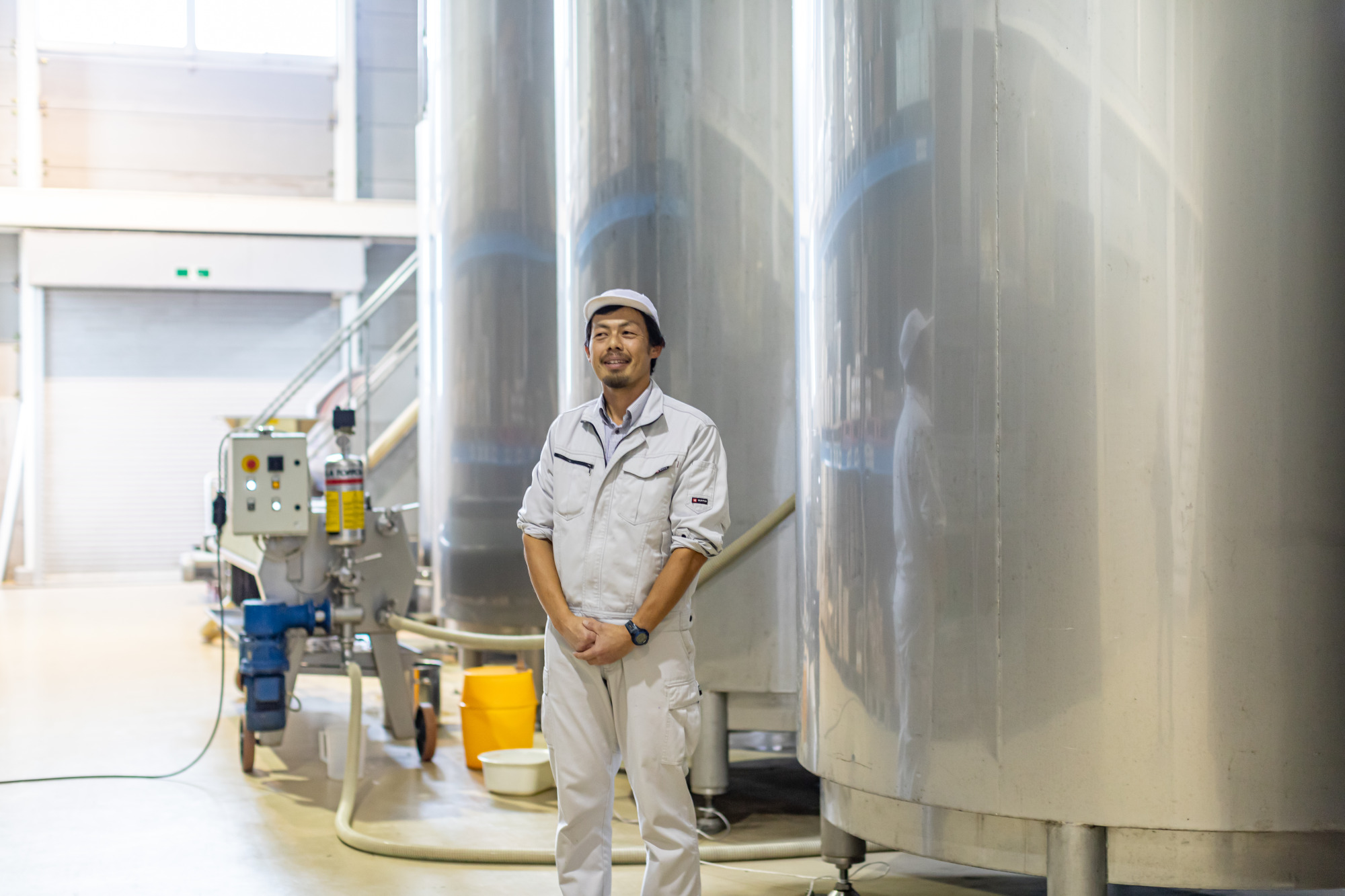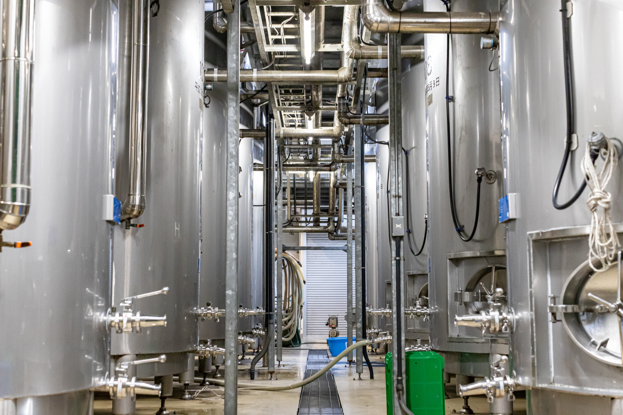 店舗からみると地下に位置するところに工場があり、大きな銀のタンクが並びます。