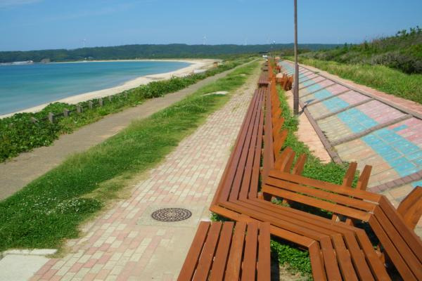 増穂浦海岸と横手にながーく伸びる「世界一長いベンチ」。ギネスブックにも記録され、全長460.9メートルにもなります!