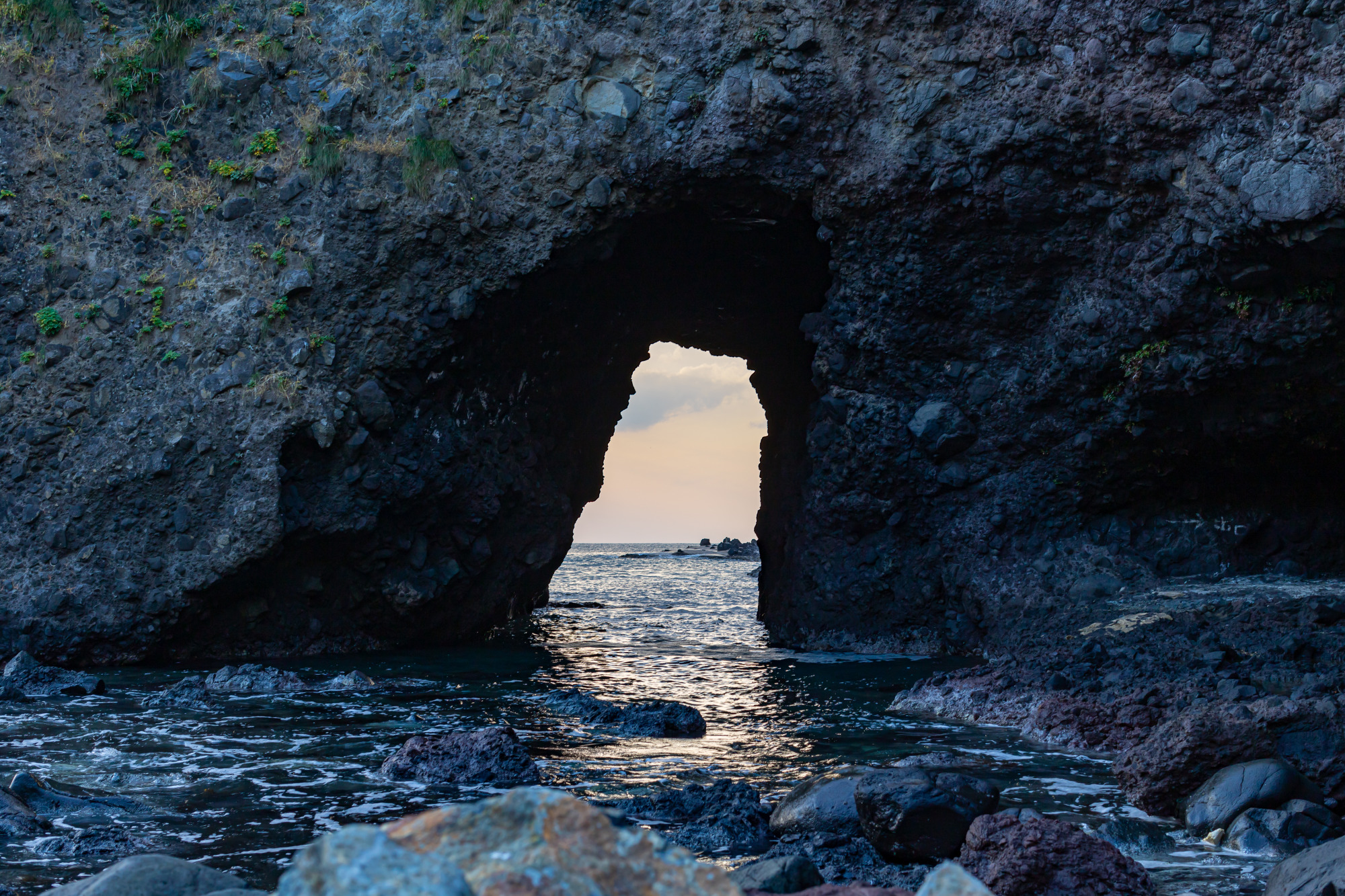 その降下途中にある「巌門洞窟」。階段を降り始めると低い天井と辺りが急に暗くなります。そのまま歩くと外の光が見え始め、洞窟を抜けるとあの大きな洞門が目の前に現れます!本当に波だけで穴が開くのだろうか?と思うほどの大きさです。