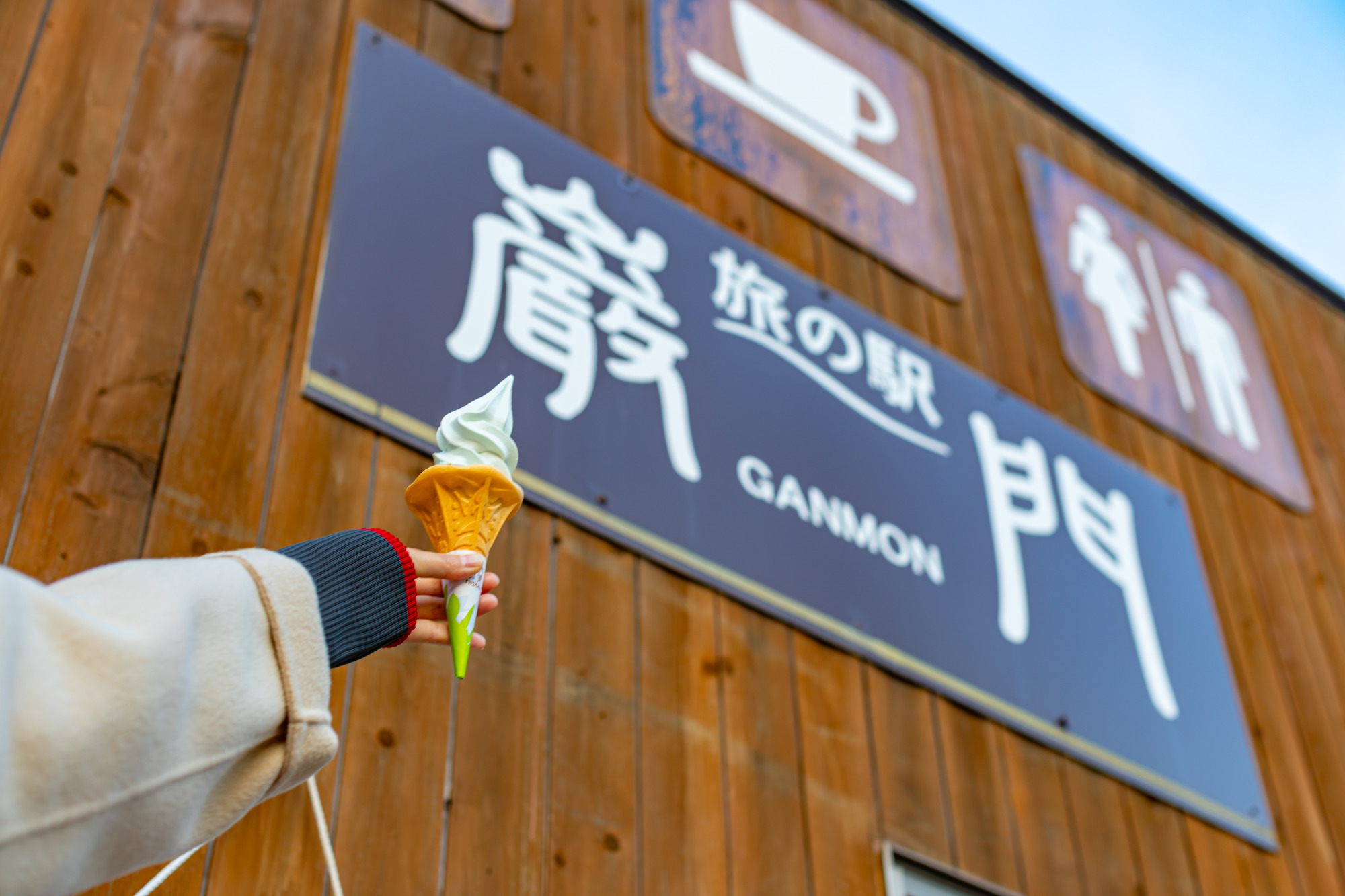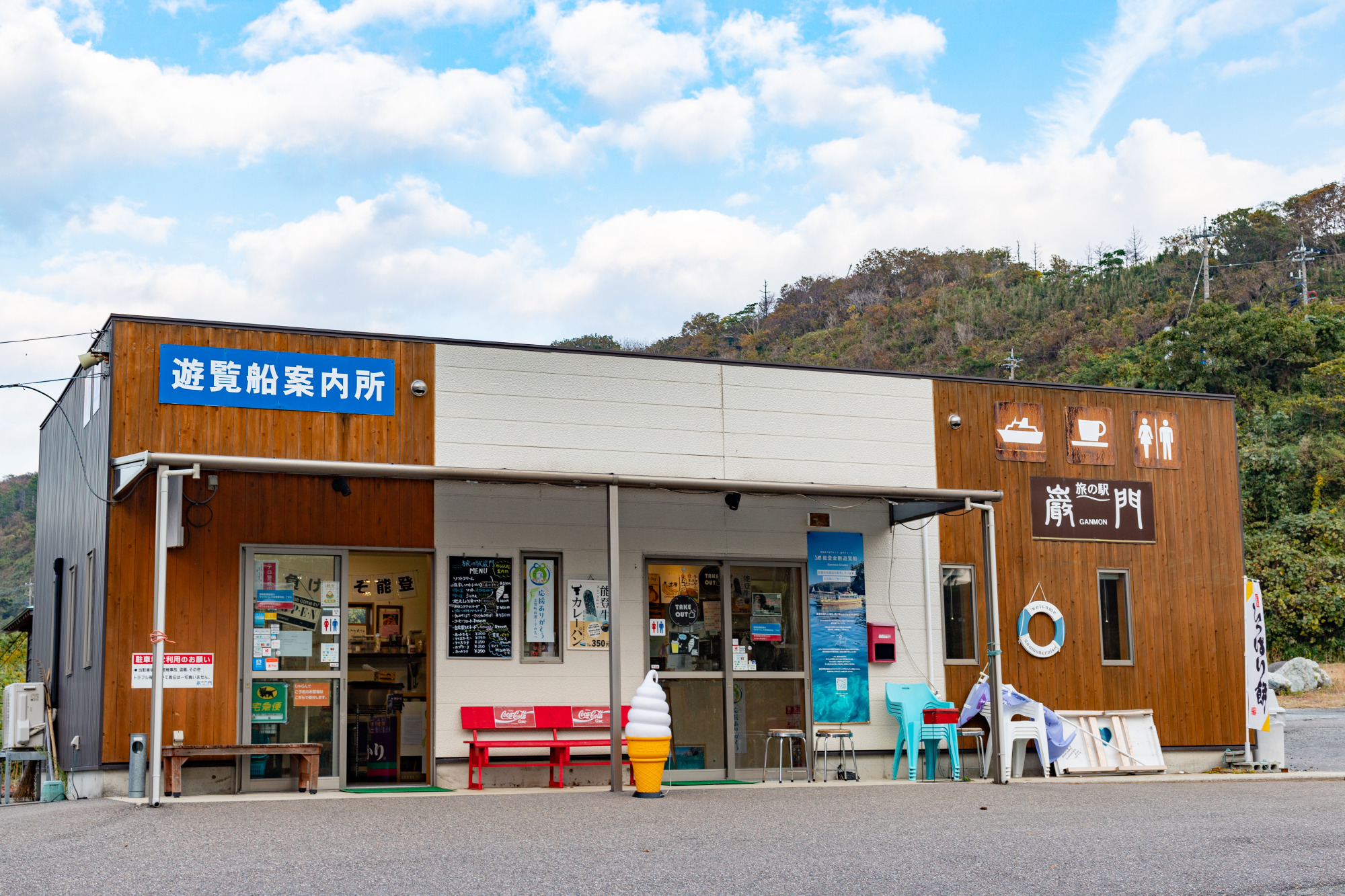 下には絶景が広がっているのですが、ソフトクリーム片手に眺めていると「休憩」になりホッと一息。夕方には少し肌寒いですが、店内で飲食もできるので問題ないですね!