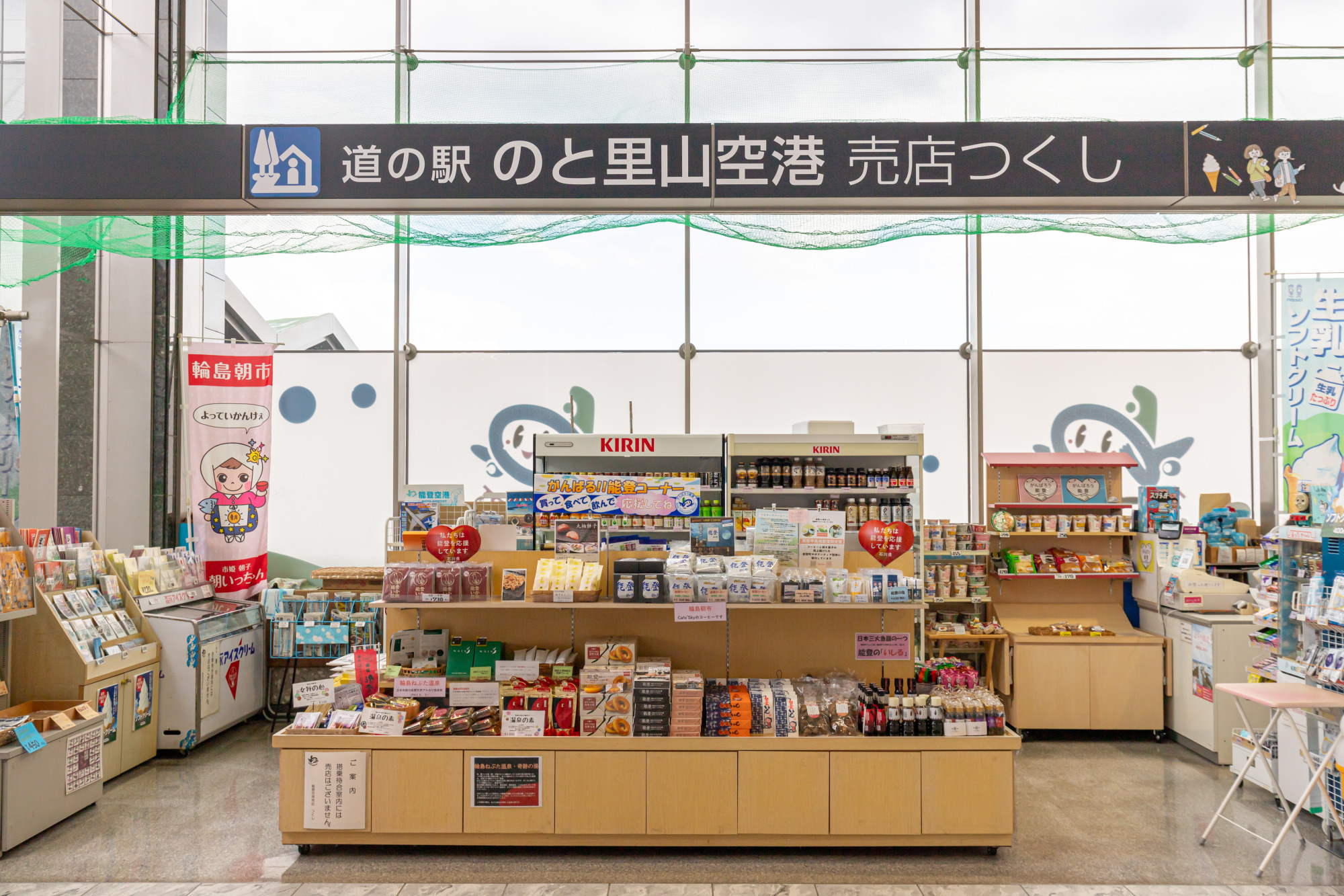 1F 売店/つくし:こちらには「能登応援コーナー」が設置してあり一押し商品が並びます。オリジナルブレンドの「能登空港ソフトクリーム」も是非!