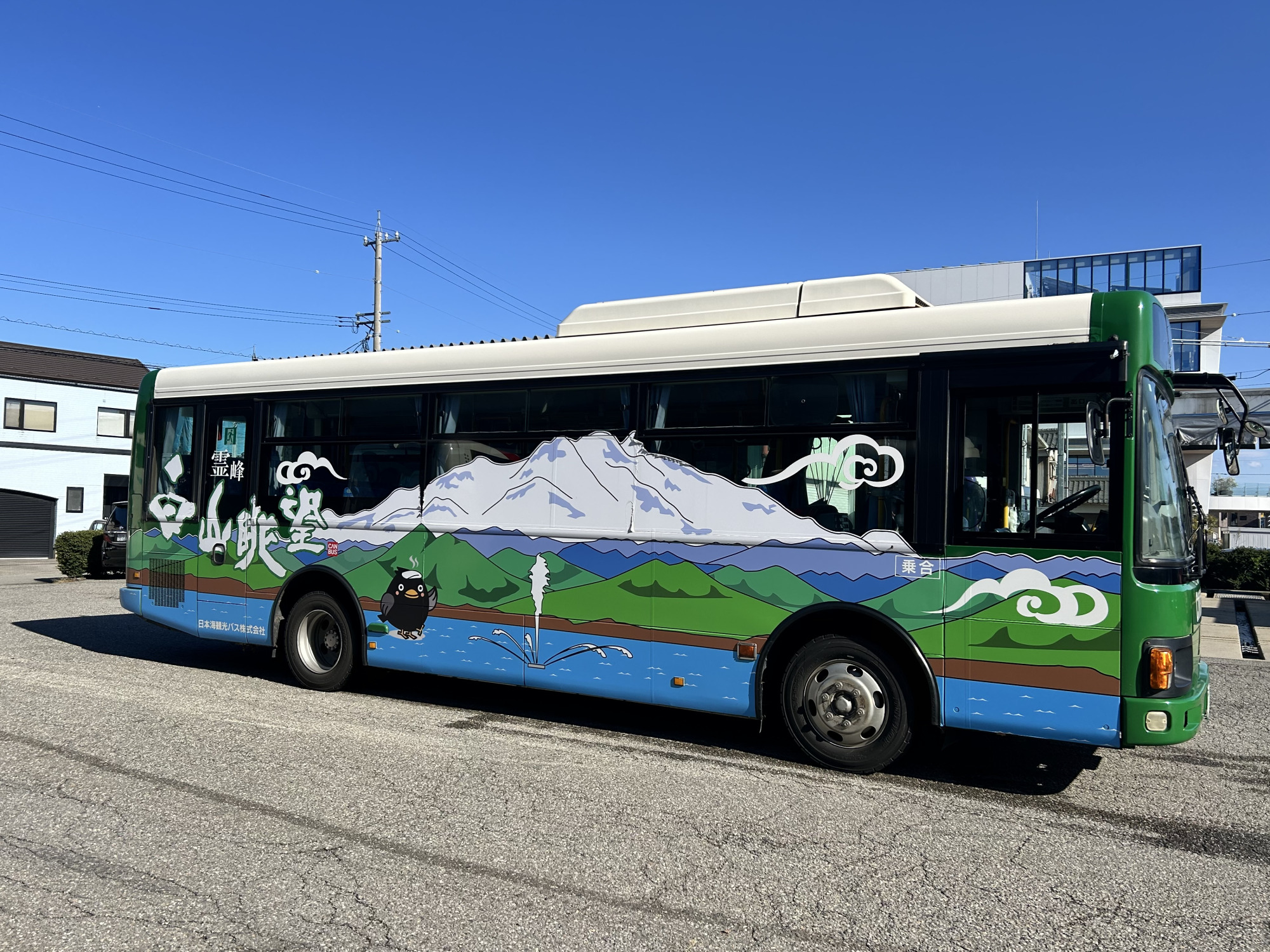 バスは赤、緑、紫の3種類があり、それぞれ加賀市を代表するキャラクターがデザインされています。今回は紫のバスの写真は撮れませんでしたが、普段は街中を元気に走っているので、見つけてみてください!