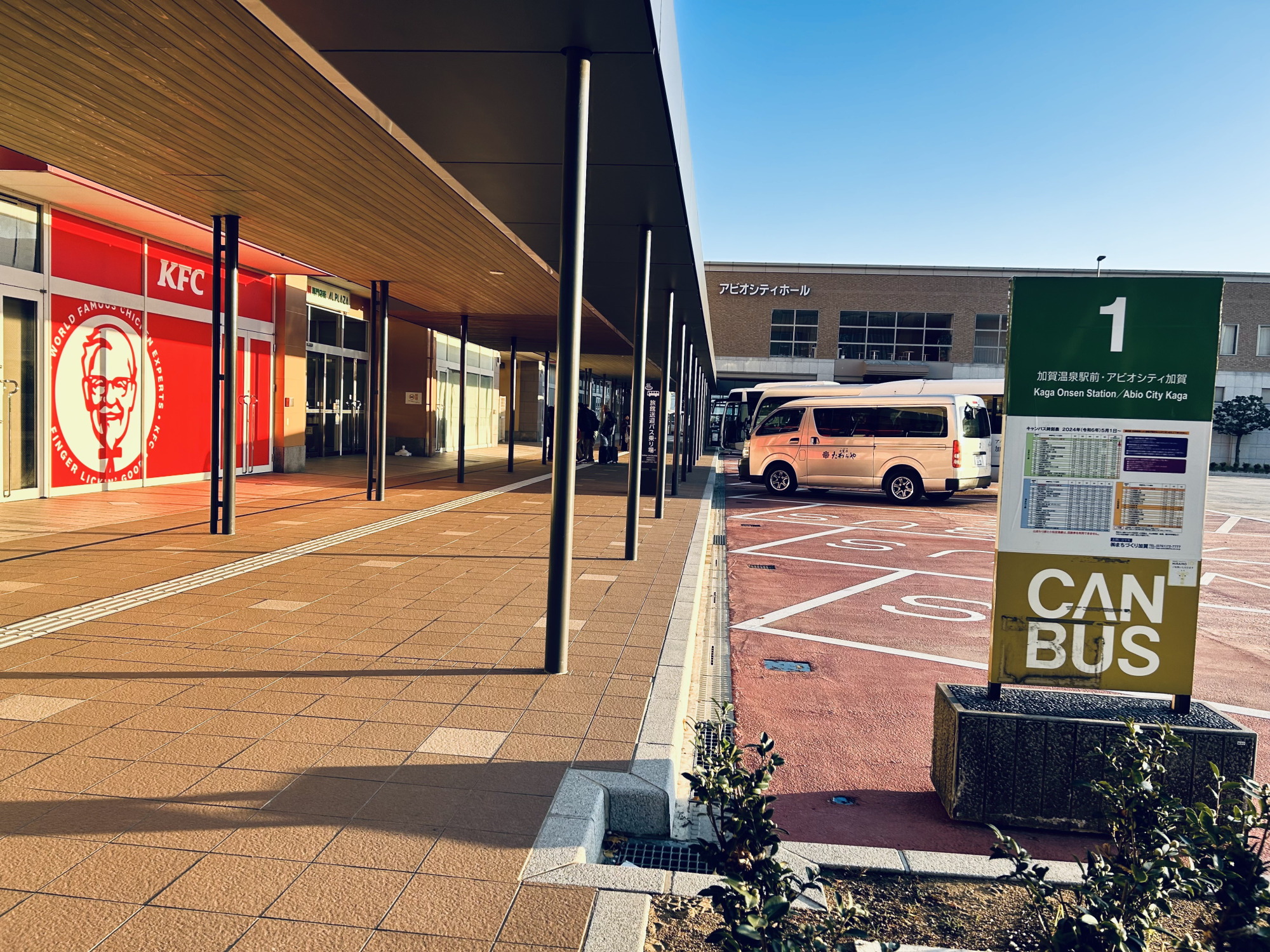 CANBUSのバス停は、JR加賀温泉駅を出て左側、アビオシティ加賀のケンタッキー前にあります。緑色の看板に「1」、黄色の看板に『CANBUS』と書かれた乗り場が目印です。 CANBUSの「海まわり線」「山まわり線」「小松空港線」では乗る線によって少し利用方法が変わってきます。