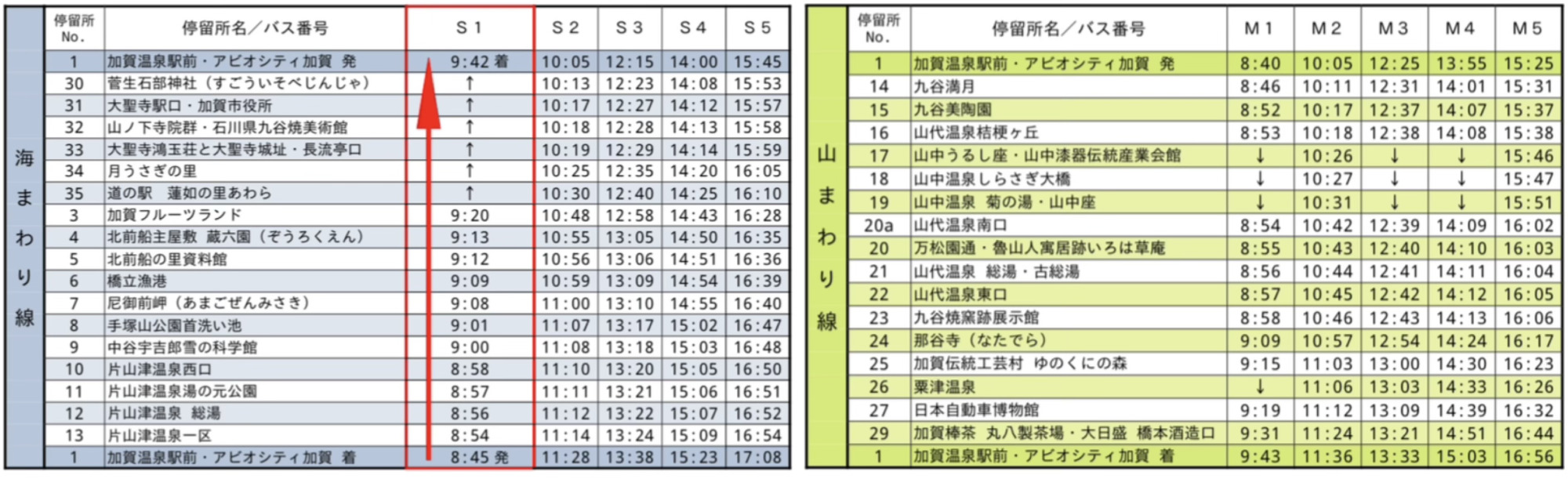 【山まわり線】![]() 10:05 JR加賀温泉駅前・アビオシティ加賀 発 ▼ 10:43 万松園通・魯山人寓居跡いろは草庵 着 ▼ 見学・周辺散策(1時間57分) ▼ 12:40 万松園通・魯山人寓居跡いろは草庵 発 ▼ 13:00 加賀伝統工芸村ゆのくにの森 着 ▼ 見学・体験(1時間30分) ▼ 14:30 加賀伝統工芸村ゆのくにの森 発 ▼ 15:03 JR加賀温泉駅前・アビオシティ加賀 着 | 【海まわり線】![]() 10:05 JR加賀温泉駅前・アビオシティ加賀 発 ▼ 10:48 加賀フルーツランド 着 ▼ 体験・お買い物(2時間10分) ▼ 12:58 加賀フルーツランド 発 ▼ 13:06 北前船の里資料館 着 ▼ 館内見学(30分) 徒歩:見学・周辺散策・昼食(1時間20分) ▼ 14:55 尼御前岬 発 ▼ 15:23 JR加賀温泉駅前・アビオシティ加賀 着 |
