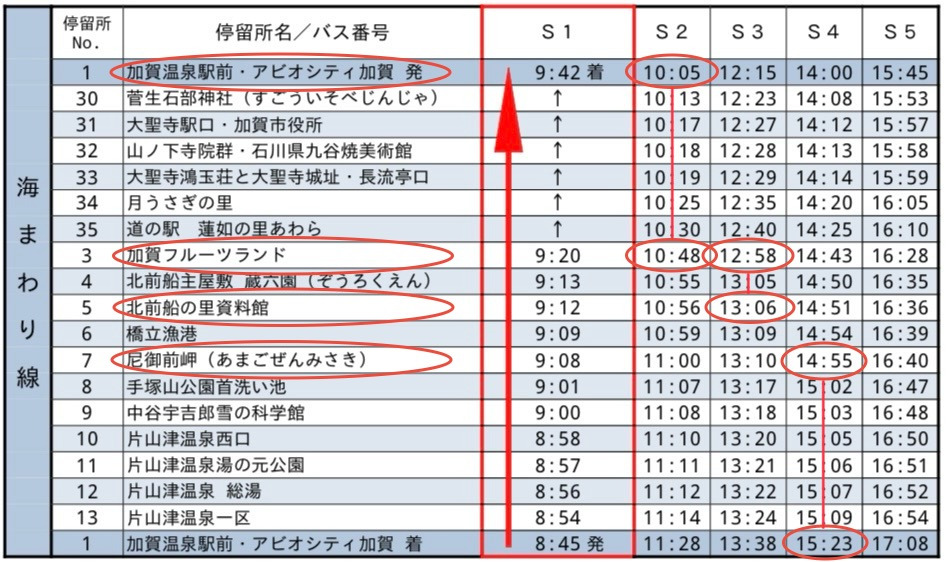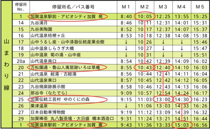 CANBUSは一方向に進むため、帰りのバスを調べる手間がありません。同じ線のバスに乗れば、最終的に加賀温泉駅へ戻れます。