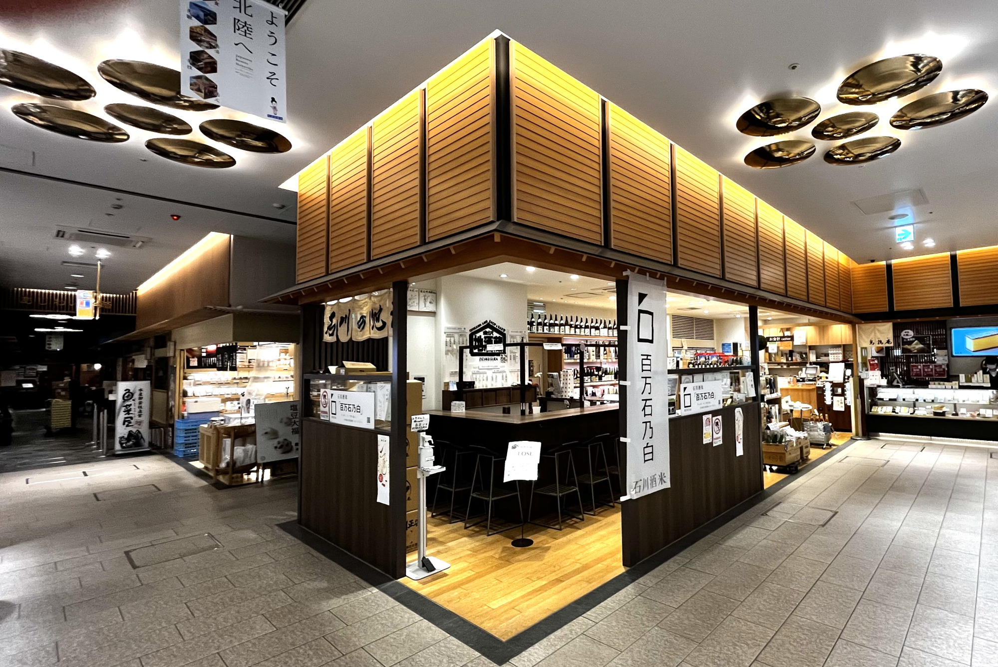 金沢地酒蔵は、石川県の地酒を手軽に楽しめるスポットです。北陸の玄関口として、厳選された地元酒蔵の日本酒が一堂に集められています。試飲スペースも設けられており、気軽に味わいを楽しみながらお気に入りの一本を選ぶことができます。